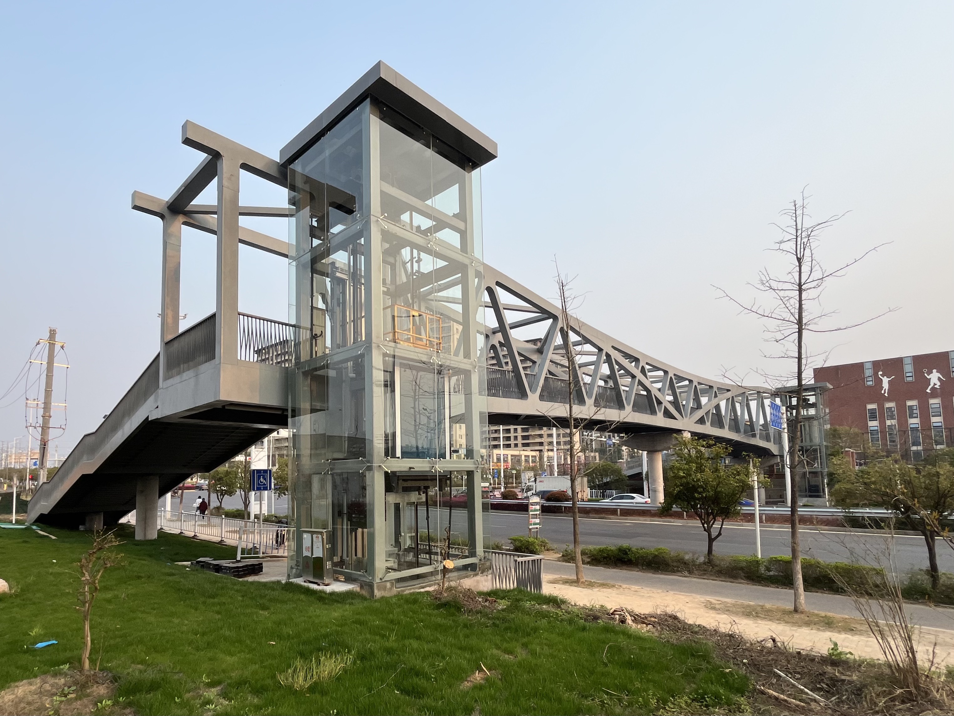 这座人行天桥限高5米,两端除了有人行梯道,还安装有电梯,电梯暂未投入使用。记者从市住房和城乡建设局了解到,这是目前株洲第一座配备有电梯的人行天桥。