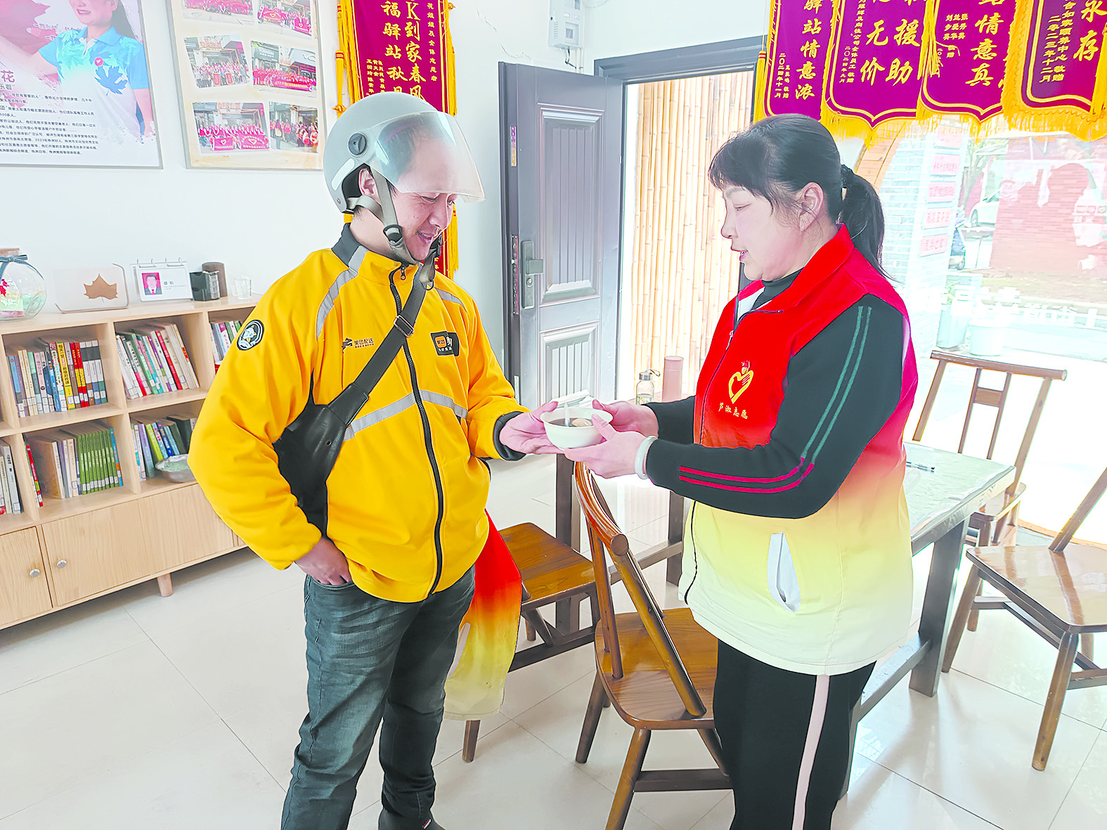 志愿者将鸡蛋和地菜汤均匀分装进碗中,送到老人、外卖小哥手中。“阿姨您端好,小心别烫着了!”志愿者嘱咐道。老人们吃着鸡蛋喝着汤,不仅温暖了胃,更暖和了心。