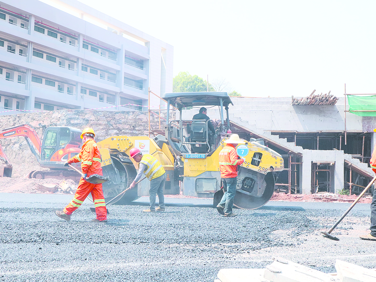 在田心中学新建的田径场内,工人们正在进行沥青摊铺作业。 记者/肖星平 摄