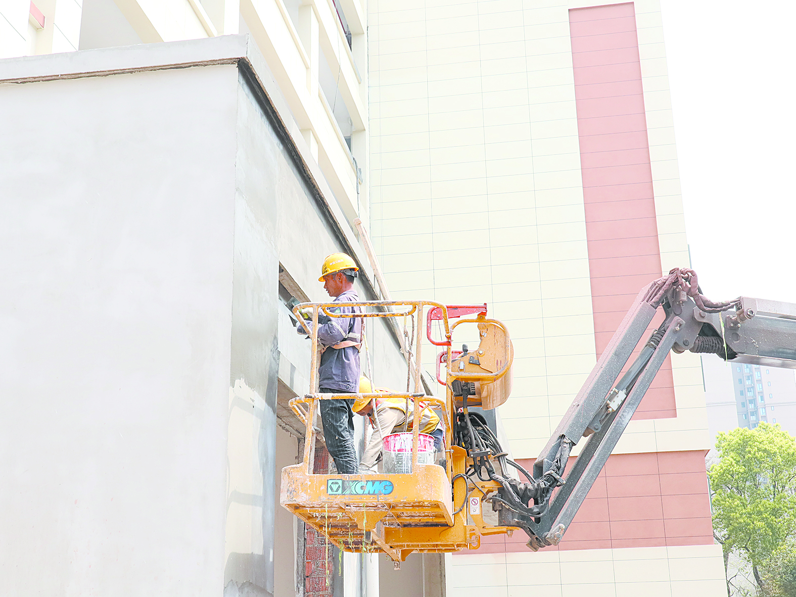 在九方中学新男生宿舍楼外,两名工人正对宿舍门头进行粉刷作业。 记者/肖星平 摄