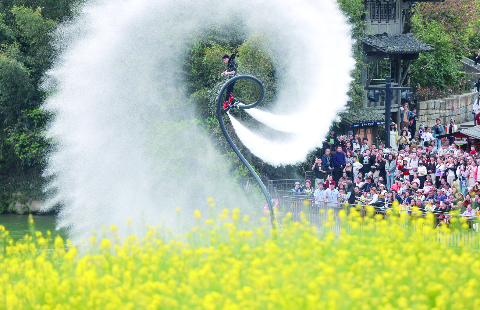 4月4日,游客在贵州省遵义市乌江寨景区观看水上表演。 清明假期,人们来到户外踏青、赏花,感受美好春光。 新华社发(袁福洪摄)