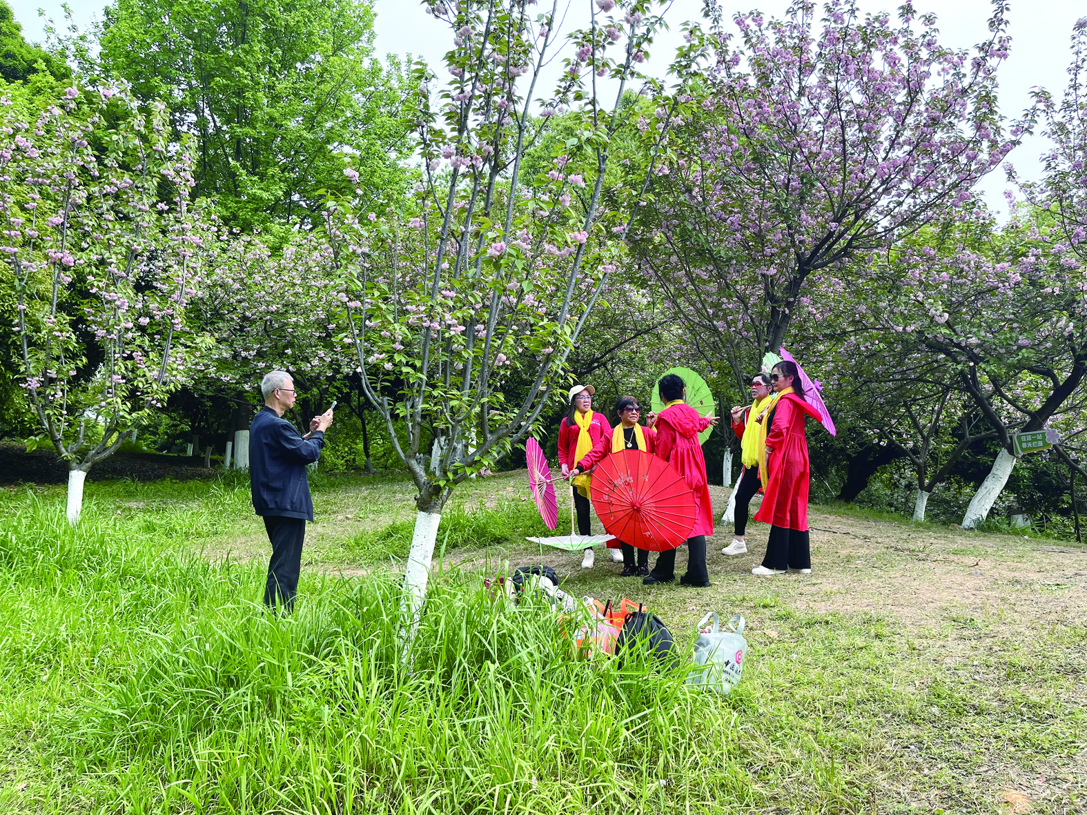 4月8日,石峰公园樱花园,晚樱进入盛花期,吸引不少市民相约游园,畅游“花海”。