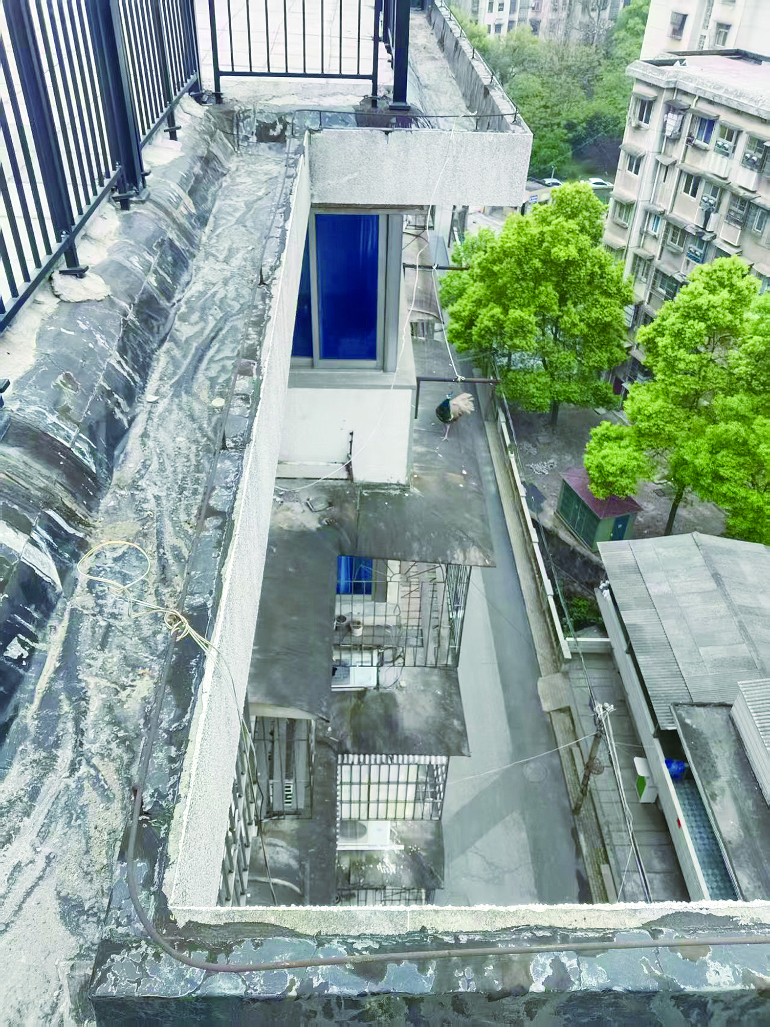 当日7时许,物业巡查员宋先生在楼顶发现这只羽毛翠绿、身姿矫健的孔雀,因发现其嘴部受伤且焦躁不安,在楼顶来回走动。他立即上报社区网格员,云峰阁社区迅速启动应急机制,民警、石峰公园管理处专业人员很快赶赴现场。