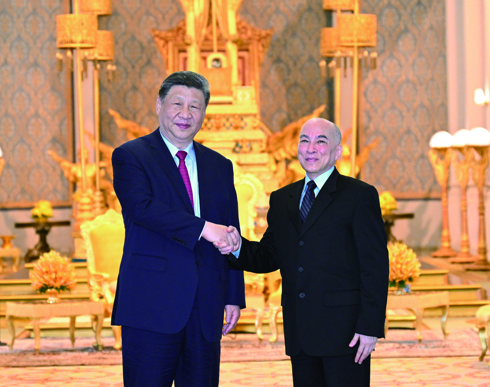 4月17日下午,柬埔寨国王西哈莫尼同中国国家主席习近平在金边王宫举行会见。新华社记者 李学仁 摄