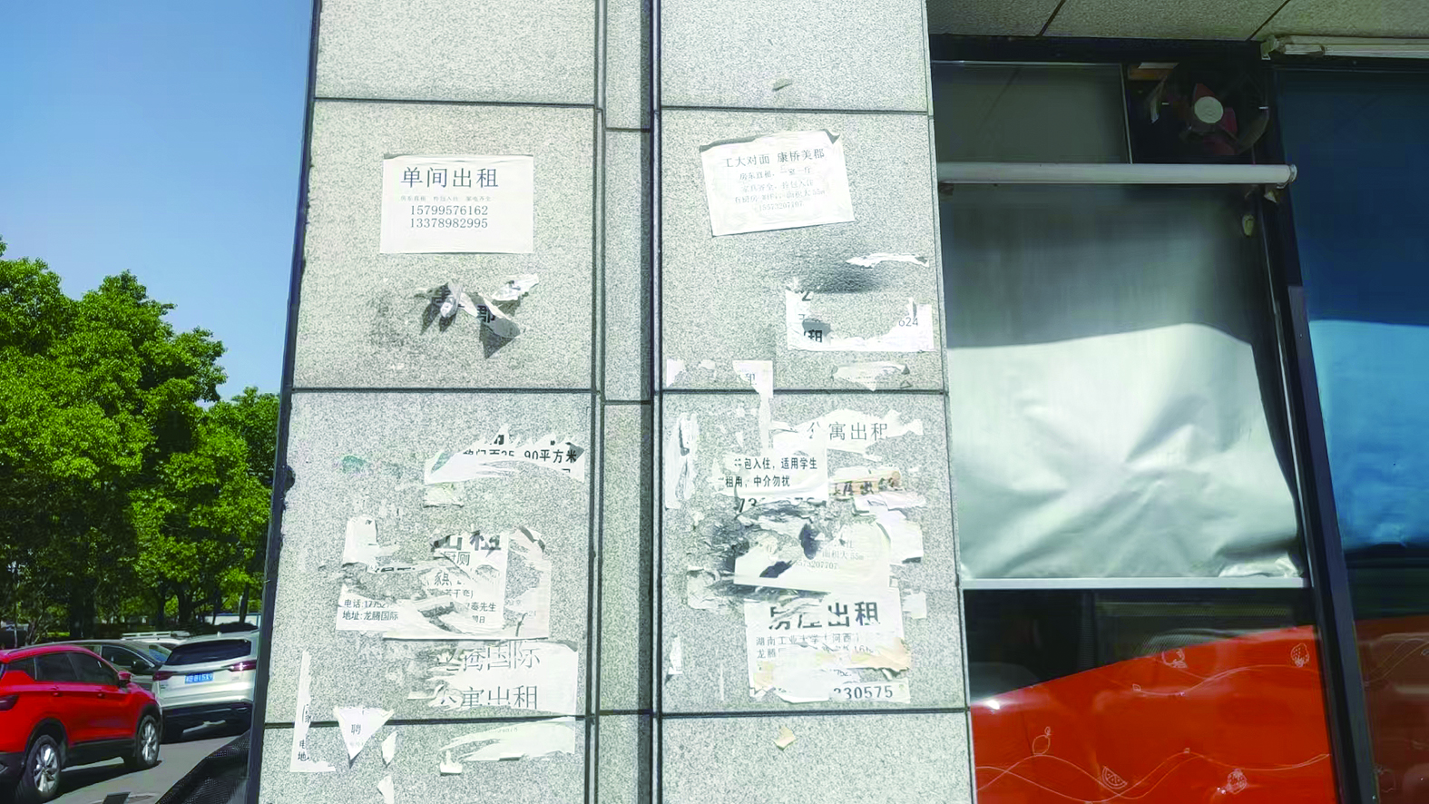 天元区泰山路附近一店铺旁张贴的小广告。记者/赖杰琦 摄