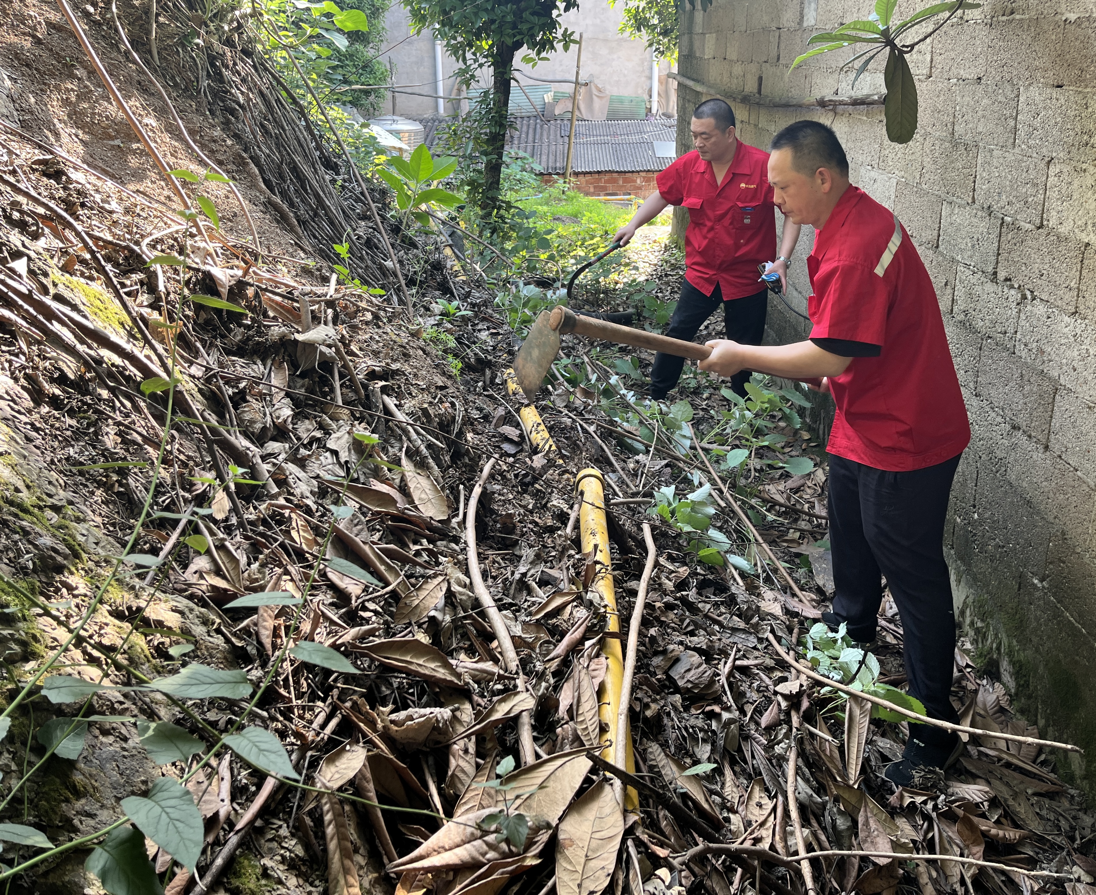 燃气巡检员对掩埋户外天然气架空管道的泥土进行清理。 记者/刘平 摄
