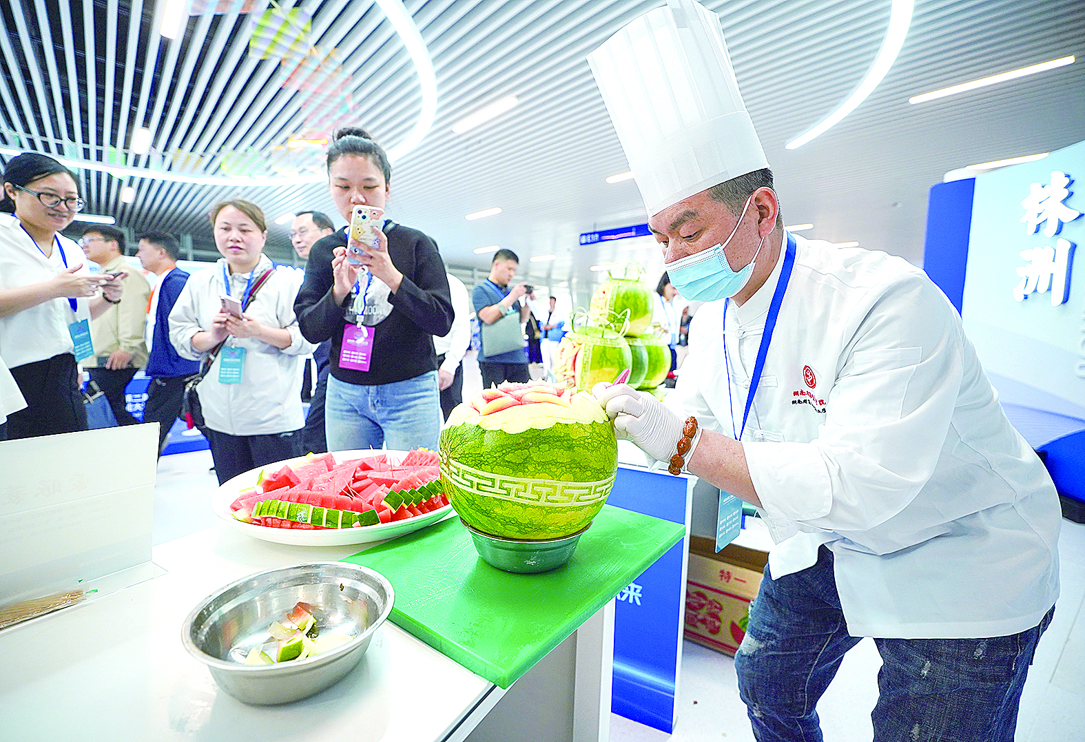 绝技绝活展演现场,西瓜雕刻吸引观众眼球。