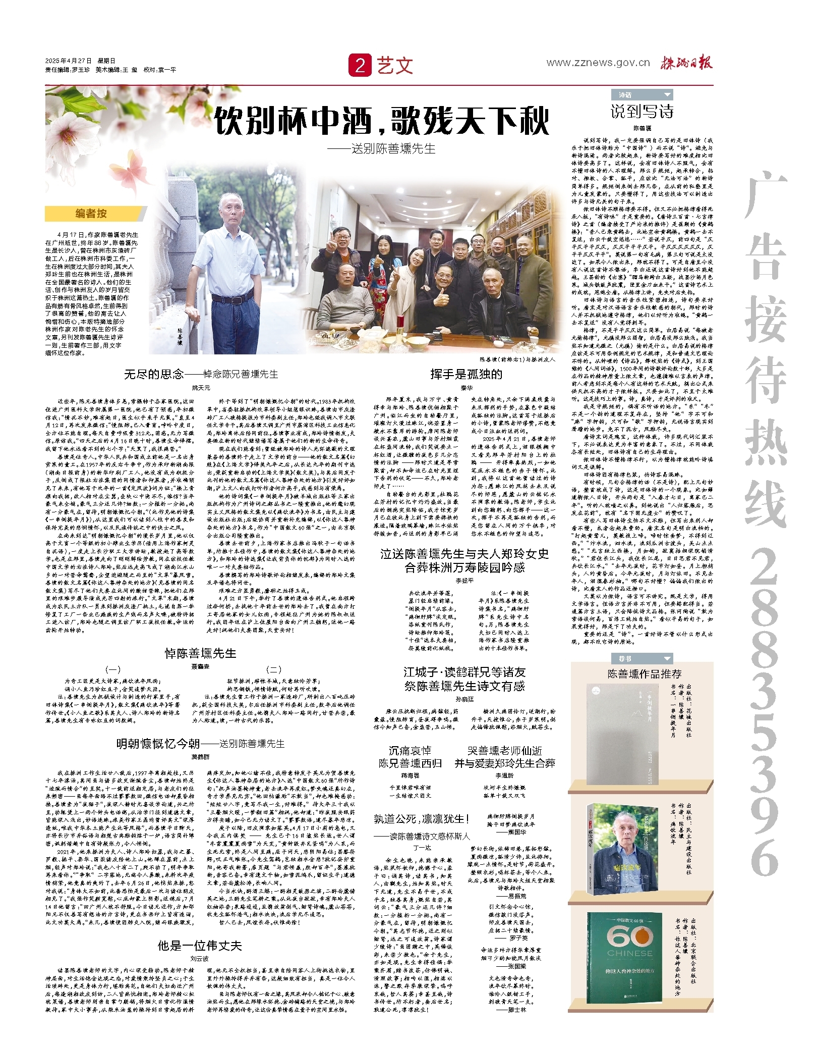 4月21日下午,举行了善壎的遗体告别式。他启程跨过奈何桥,去找他十年前去世的郑玲去了。我曾在南方打工寄居他家的女儿红雨,专程赶往广州为她的陈叔叔送行。我因年迈在沪上住屋阳台面向广州三躹躬,送他一路走好!祝他们夫妻团聚,天堂安好!