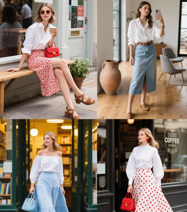 格纹图案的半裙在春夏也很实穿,大方格和维希格这类简约的格子比较不会热,搭配白衬衫文艺又大方,推荐给上班族女生。波点半裙搭配白色衬衣,安静又清爽,也是打造经典造型的标志性组合。