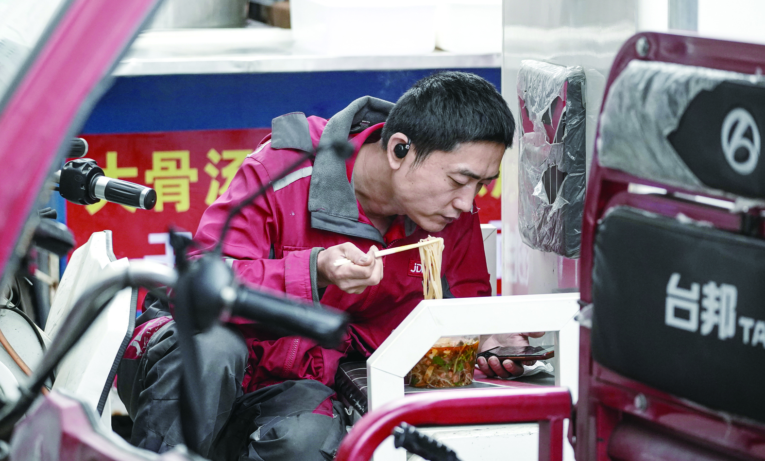 芦淞市场群,快递员一边吃早饭,一边关注快递信息。刘震 摄