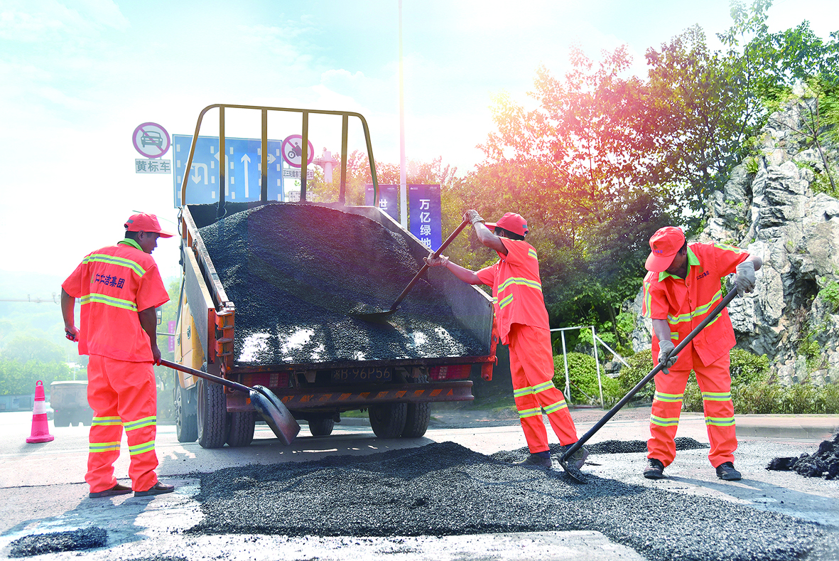 工人们在沥青腾起的层层热气中进行道路养护工作。市总工会 供图
