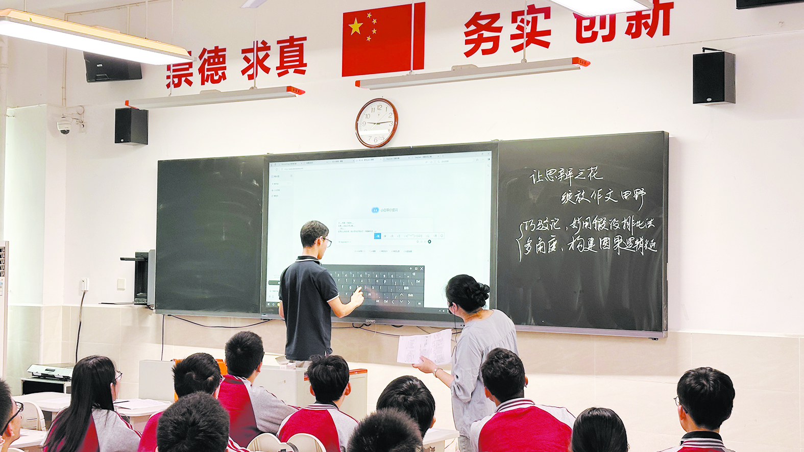 “请运用以上标志词,加上司马迁写史记、孙膑兵法、勾践灭吴等关键词,从多角度构建因果逻辑链,写一段思辨性的议论段……”4月29日上午,一堂生动的“AI+语文”课堂,在南方中学的合班教室里举行。在教学过程中,老师引导学生向AI平台“投喂”关键词,为同学拓展思维的空间。