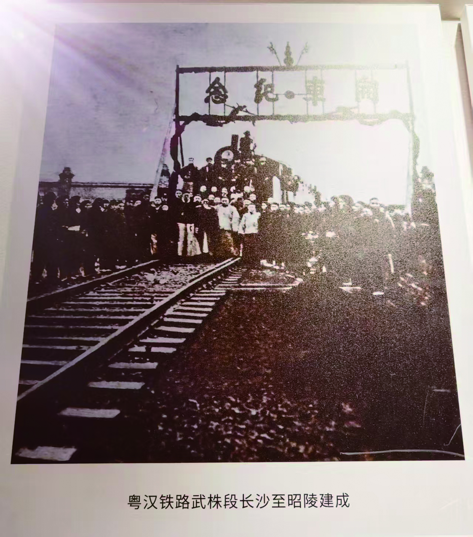 去年底,我无意间看到一张有关铁路的黑白老照片。照片里一群穿着长袍马褂的人在一张“开车纪念”的拱门下合影。合影中有一个模糊的火车车头,一大群人簇簇拥拥,几个人站在机车车头的踏板上,大多数人围在车头的左右两旁,铁轨就在他们站的位置向远处延伸。更让我吃惊的是,照片下面工工整整地写着一行字:粤汉铁路武株段长沙至昭陵建成。