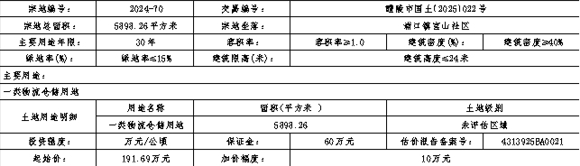 2024-70:(一)竞得者应在成交确认书签订之日起10个工作日内签订出让合同。(二)该地块带地面建筑物出让,房产建筑面积585.24平方米,房产价款为84.63万元,竞得单位须在出让合同签订之日起30日内缴清房产价款,如不能按时支付房屋价款,自滞纳之日起,每日按延迟支付款项的1‰向出让人缴纳违约金。(三)土地成交价款由竞得者在出让合同签订之日起半年内全额缴清,逾期未缴部分,根据相关规定,征收违约金。(四)由醴陵市储备中心按现状条件交地,并承担因交地产生的相关法律责任。(五)须按醴陵市自然资源局出具的《2024年浦口镇1号地块用地性质认定蓝线图及规划条件》实施。