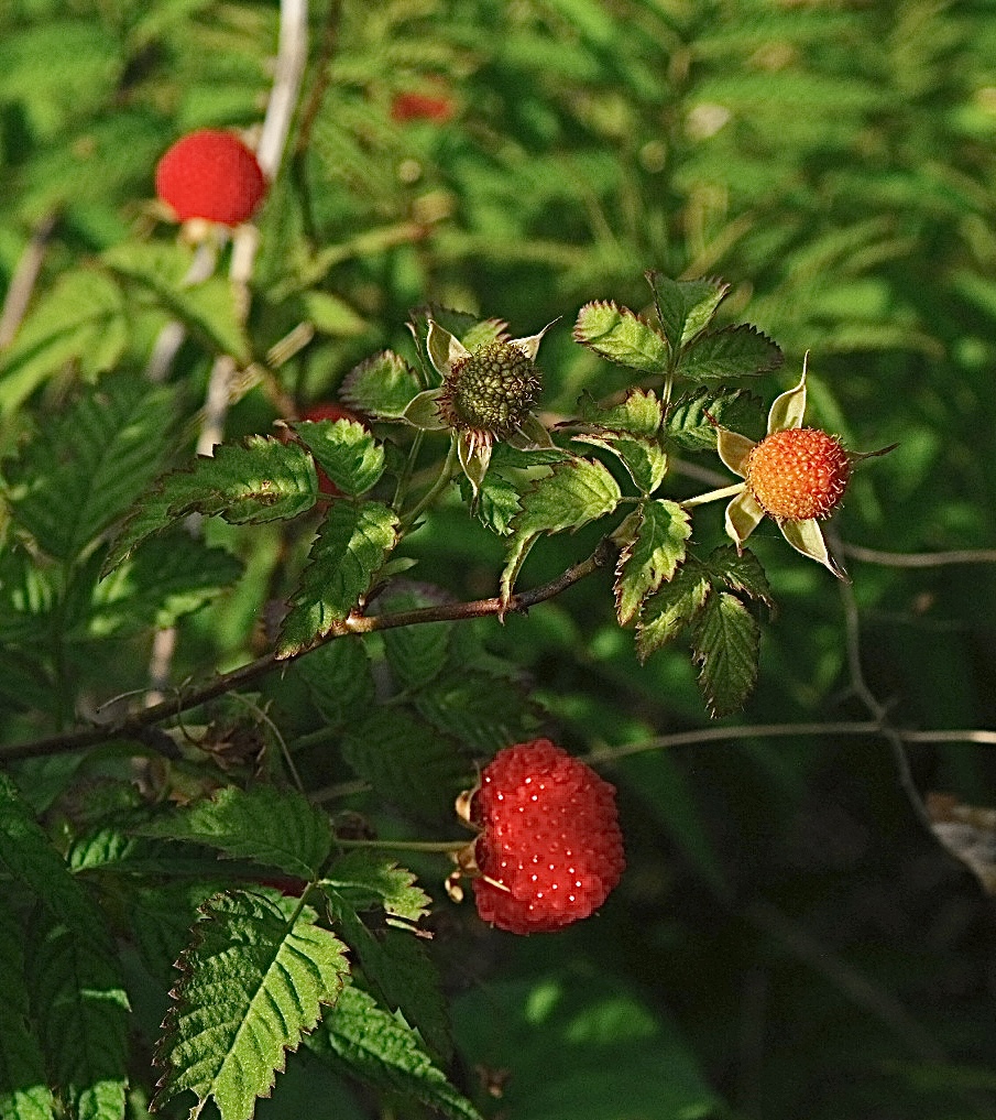 这是农村的孩子小时候吃过的最好的野果子,还有一种,我们那边方言也叫萢,学名叫覆盆子,但形状长得更像草莓,果实长椭圆形,尾部略尖,连接枝条的部分有个明显的蒂,我们叫它野草莓。它成熟得更迟一些,植株也更高,摘它要费些力气,因为它不仅高大些,还每个枝条上都长着硬刺,你得小心地去够着它,才能把长长枝条上的果子摘下来,有时候我们还要用到钩叉呢。熟透的野草莓也甜,甚至比超市的草莓更好吃。
