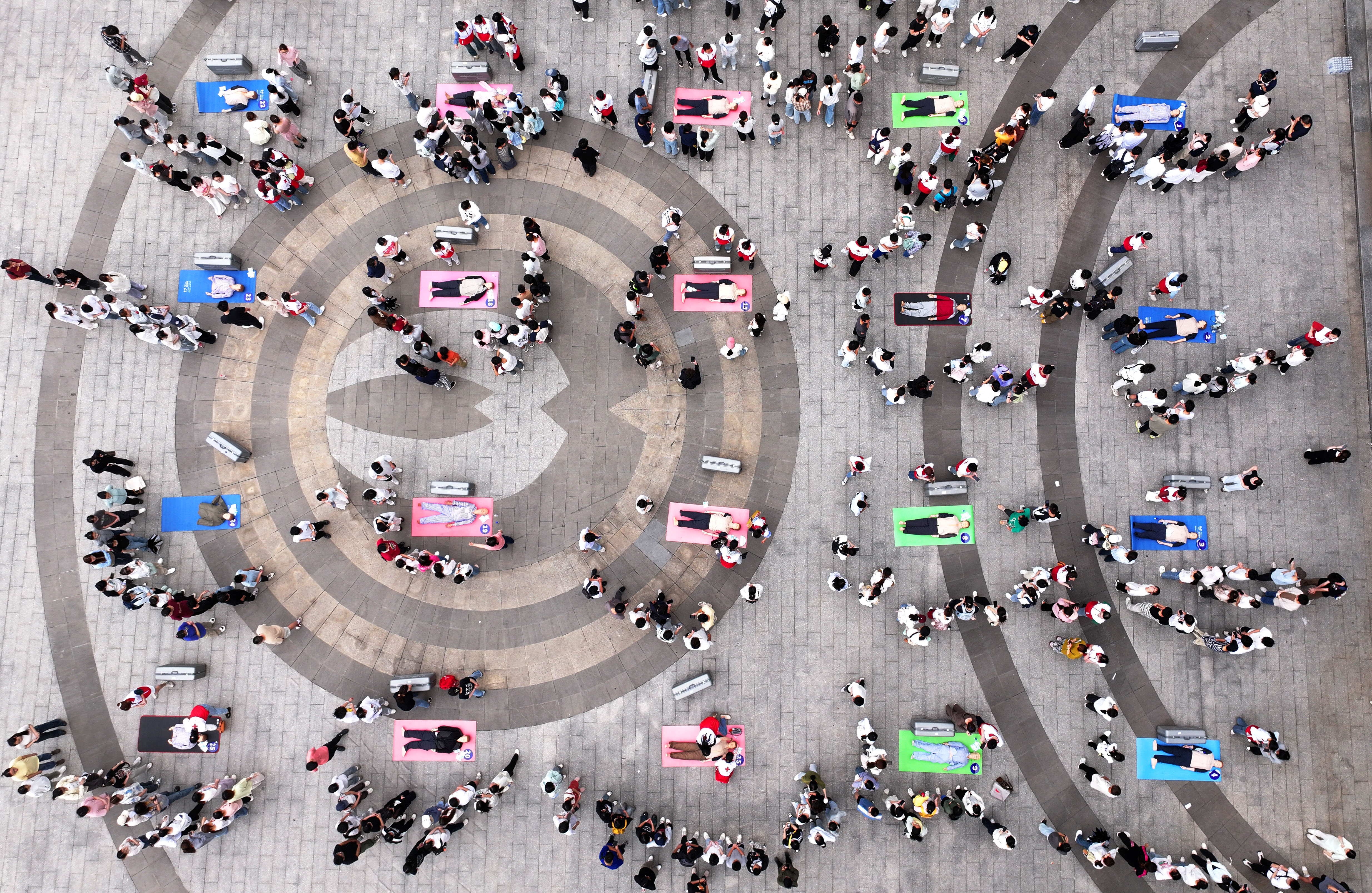 5月10日,在湖南省衡阳市,南华大学红十字会应急救护智能化培训基地的志愿者给学生们做心肺复苏急救的实操培训(无人机照片)。 5月12日是第17个全国防灾减灾日。近日来,各地开展形式多样的防灾减灾宣传教育及演练培训活动,提高人们科学防灾意识和灾害避险自救能力。 新华社发(曹正平摄)