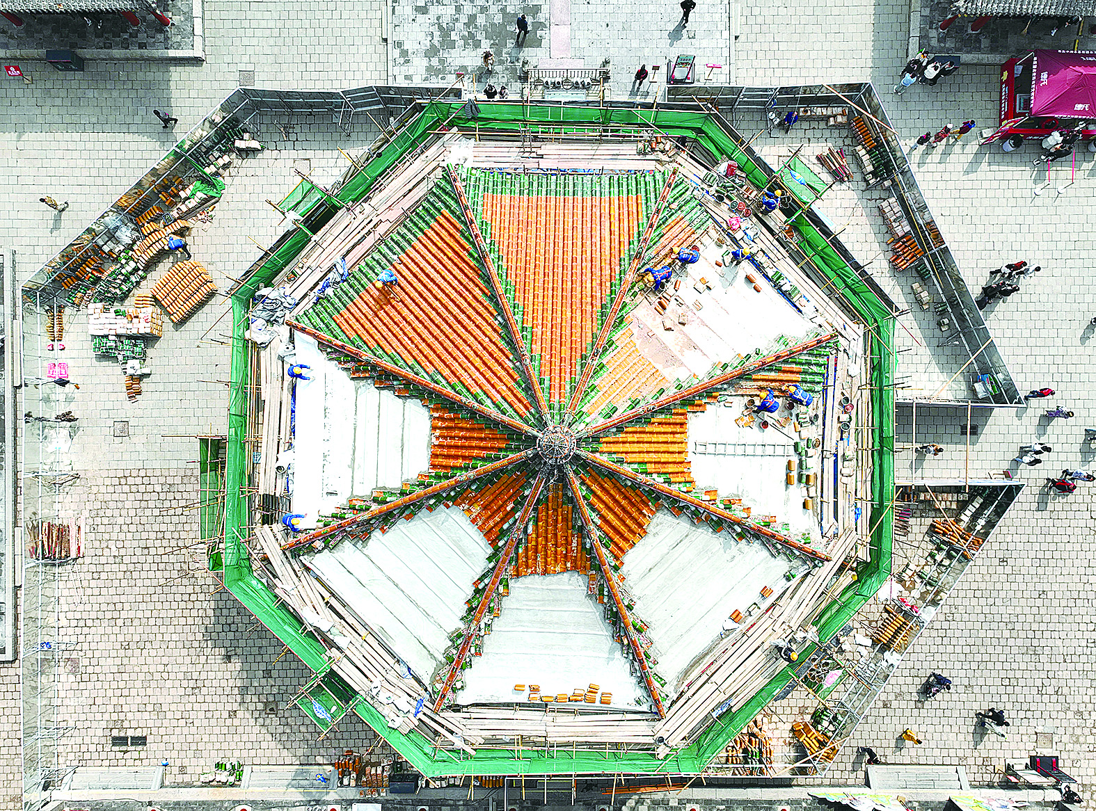 这是2025年4月6日拍摄的保养维护中的沈阳故宫大政殿(无人机照片)。