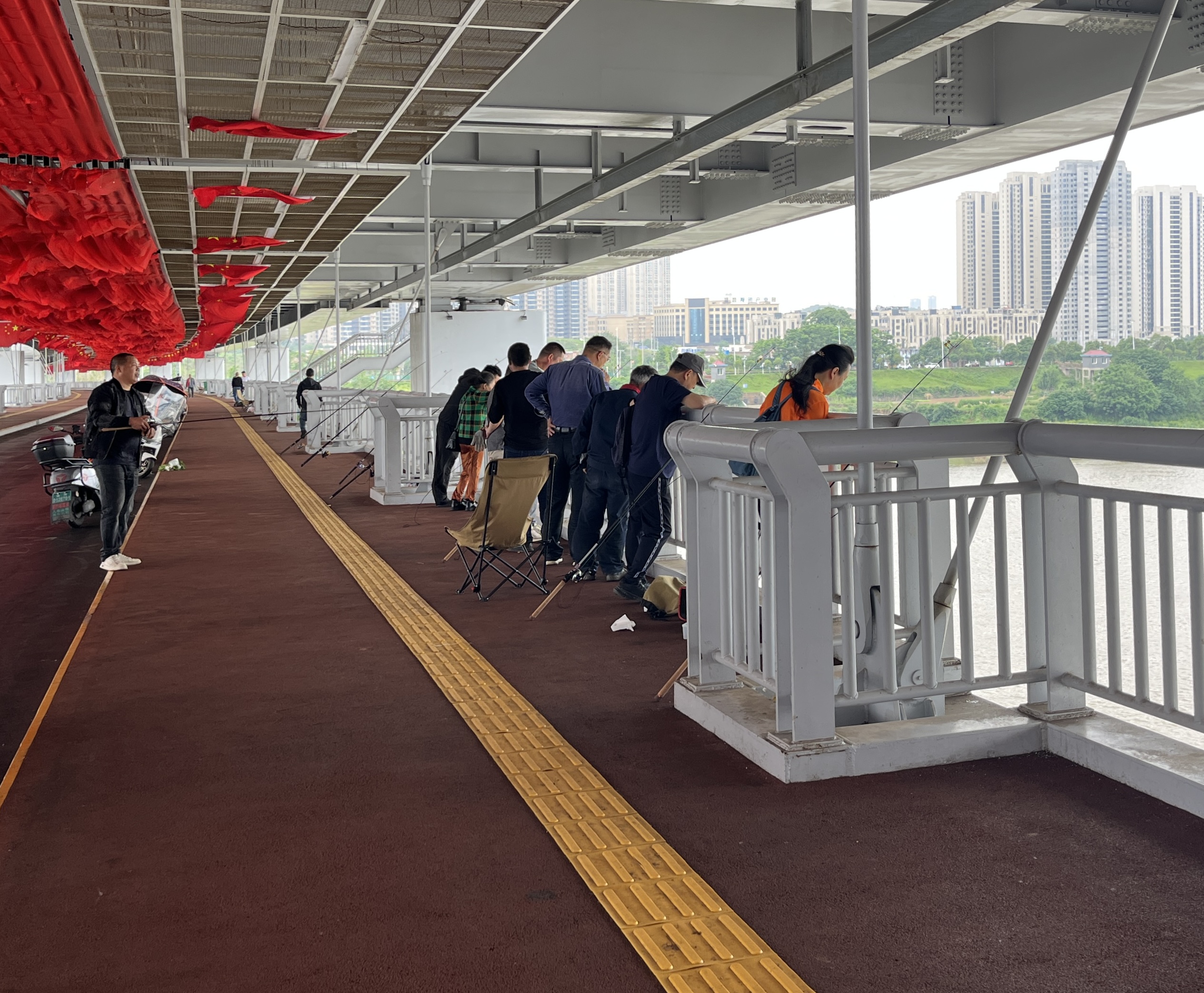 清水塘大桥(株洲八桥)景观通道上,每天都有垂钓者扎堆。护栏上摆放了很多钓竿,存在占道钓鱼、一人多竿、违规挂鱼等现象。跨江大桥上,怎么可以如此肆无忌惮地钓鱼?