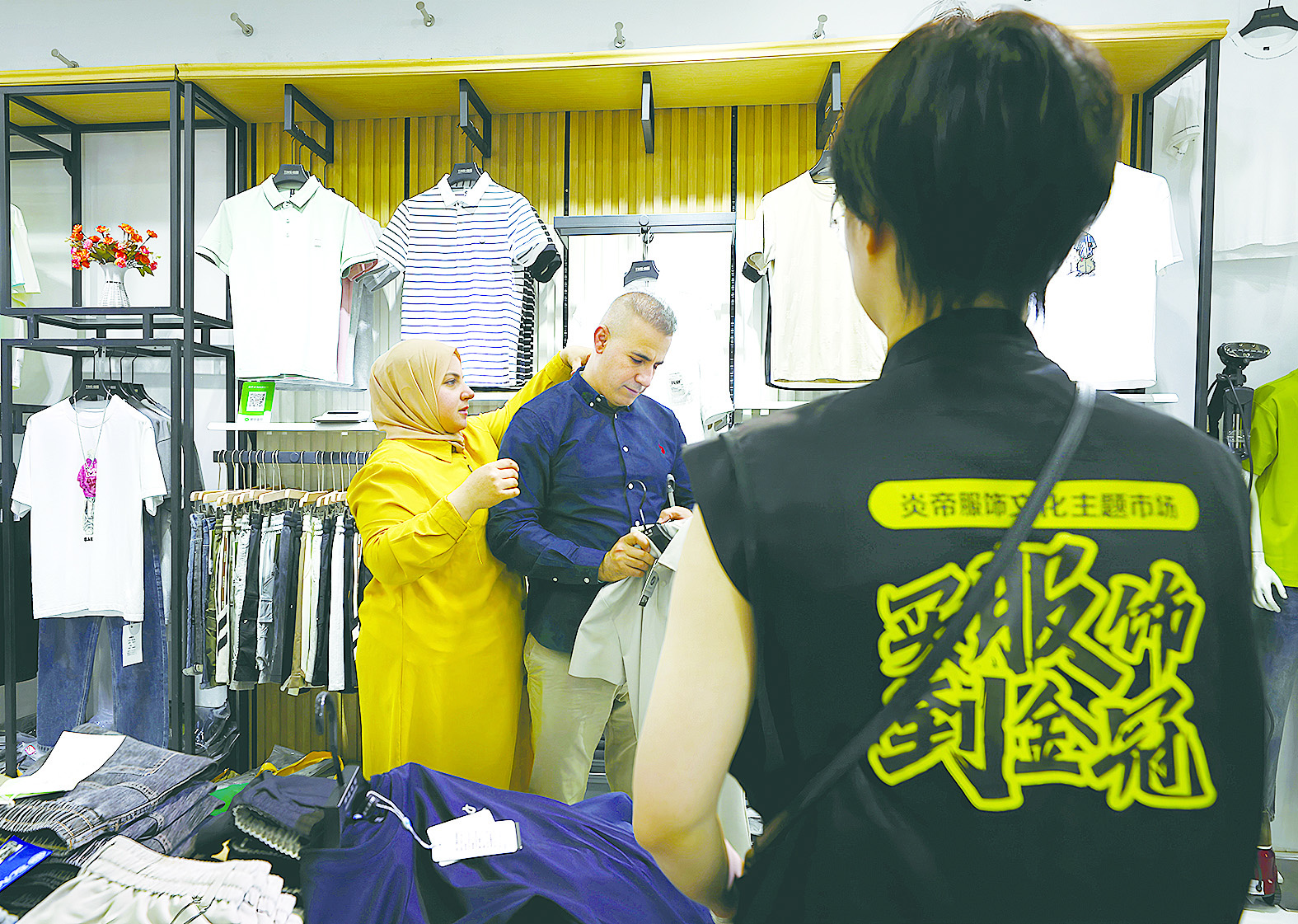 来自伊拉克的湖南大学工商管理学院博士生阿索·穆罕默德·拉蒂夫(下称阿苏),格外显眼。他带着妻子、两个儿子穿梭在商铺间,被琳琅满目的服装吸引,挑选款式、试穿、下单,一家人拎着大包小包,在市场里逛得不亦乐乎。