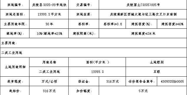 炎陵县2025-09号地块:(一)该宗工业用地实施“标准地”出让,固定资产投入强度不低于220万元/亩,地均收入不低于320万元/亩;(二)须按县自然资源局规划部门2025年4月24日出具的“炎规条件(2025)09号”规划条件及蓝线图实施;(三)按挂牌起始价全额缴纳土地竞买保证金,成交价款由竞得人自成交之日起10日内全额缴清。逾期未缴,按照违约相关规定处理;(四)成交后2个月内由炎陵高新区管委会按现状交地,水、电由供水、供电部门负责到地块边界。