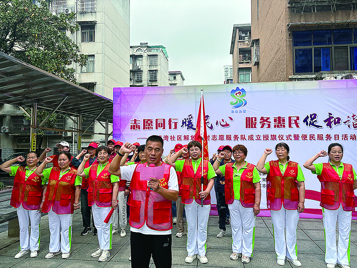 株洲日报讯(全媒体记者/李逸峰 通讯员/方欢莲) 志愿同行暖民心,服务惠民促和谐。日前,石峰区田心街道泉塘湾社区“泉心为您”解放一村志愿服务队成立授旗仪式暨便民服务日活动举行。