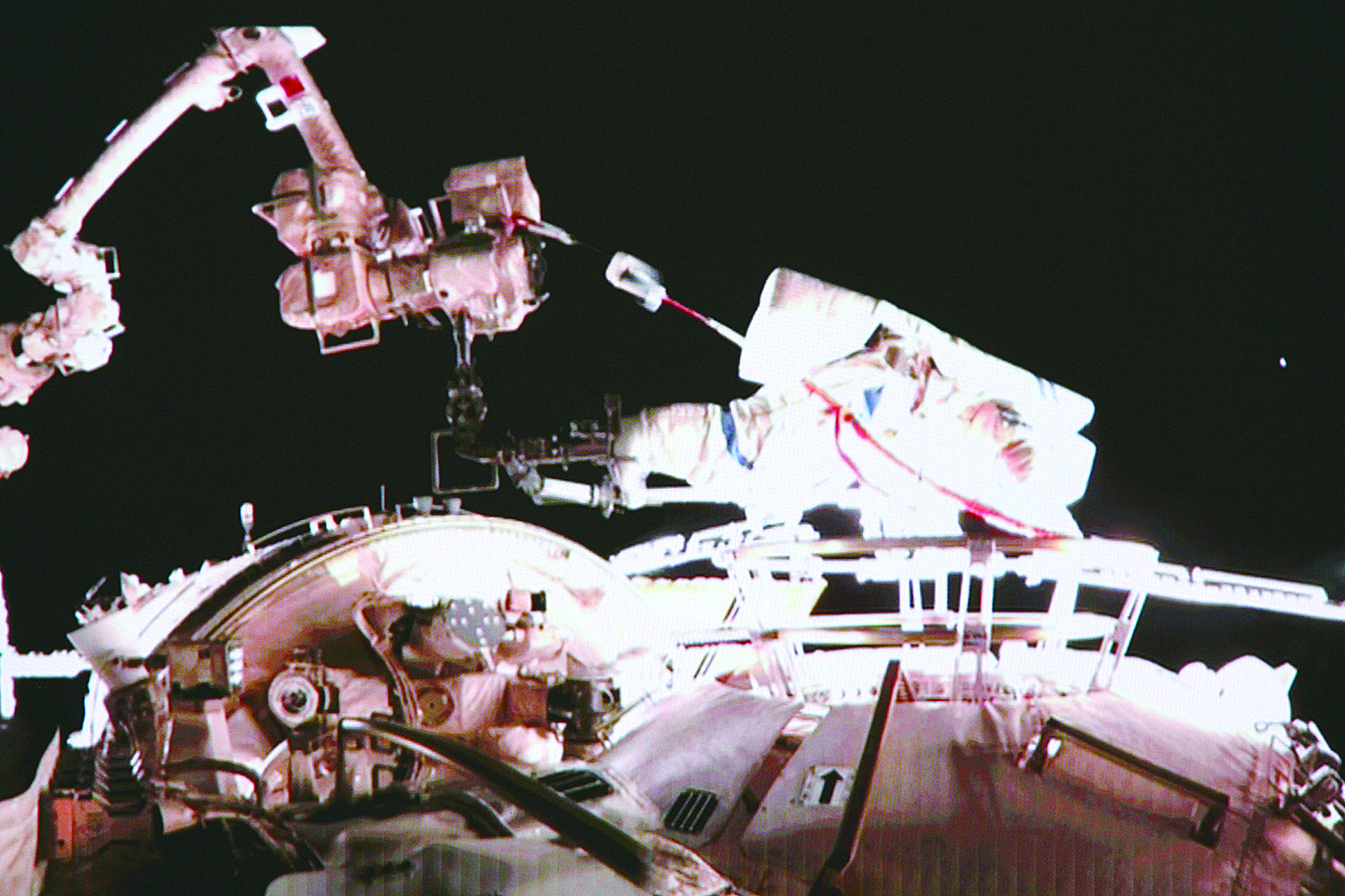 记者在北京航天飞行控制中心大屏上看到,神二十乘组指令长陈冬时隔两年多再度“太空漫步”,在机械臂辅助下抵达作业位置;航天员陈中瑞则通过攀爬空间站三舱间的“天桥”抵达;航天员王杰在舱内配合。