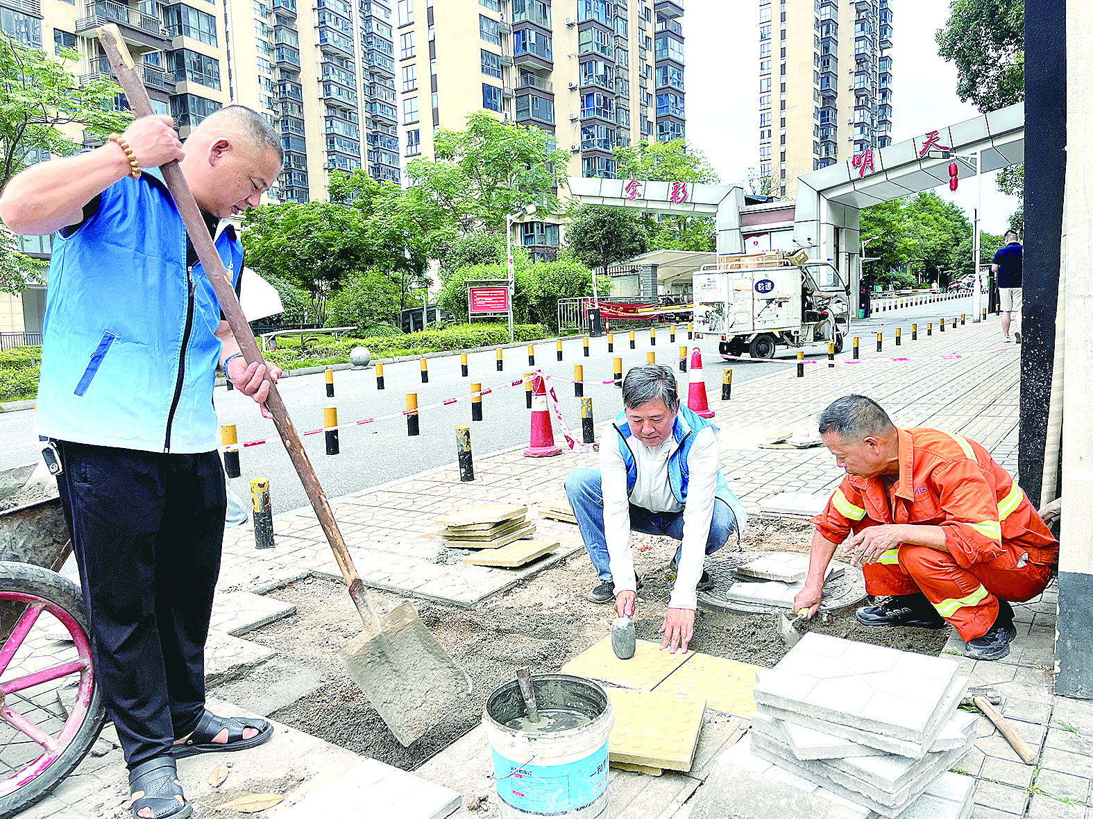 此次活动主要针对金彩明天小区内部及周边行道破损、坑洼等突出问题,开展精细化修缮作业。现场,全体党员群众分工明确、互相配合:和泥砂浆、整平土基、铺筑砂浆、摊铺板砖……每一道工序都衔接有序、认真细致。在党员群众的齐心协作下,原本坑洼不平的人行道变得平坦整洁、焕然一新。