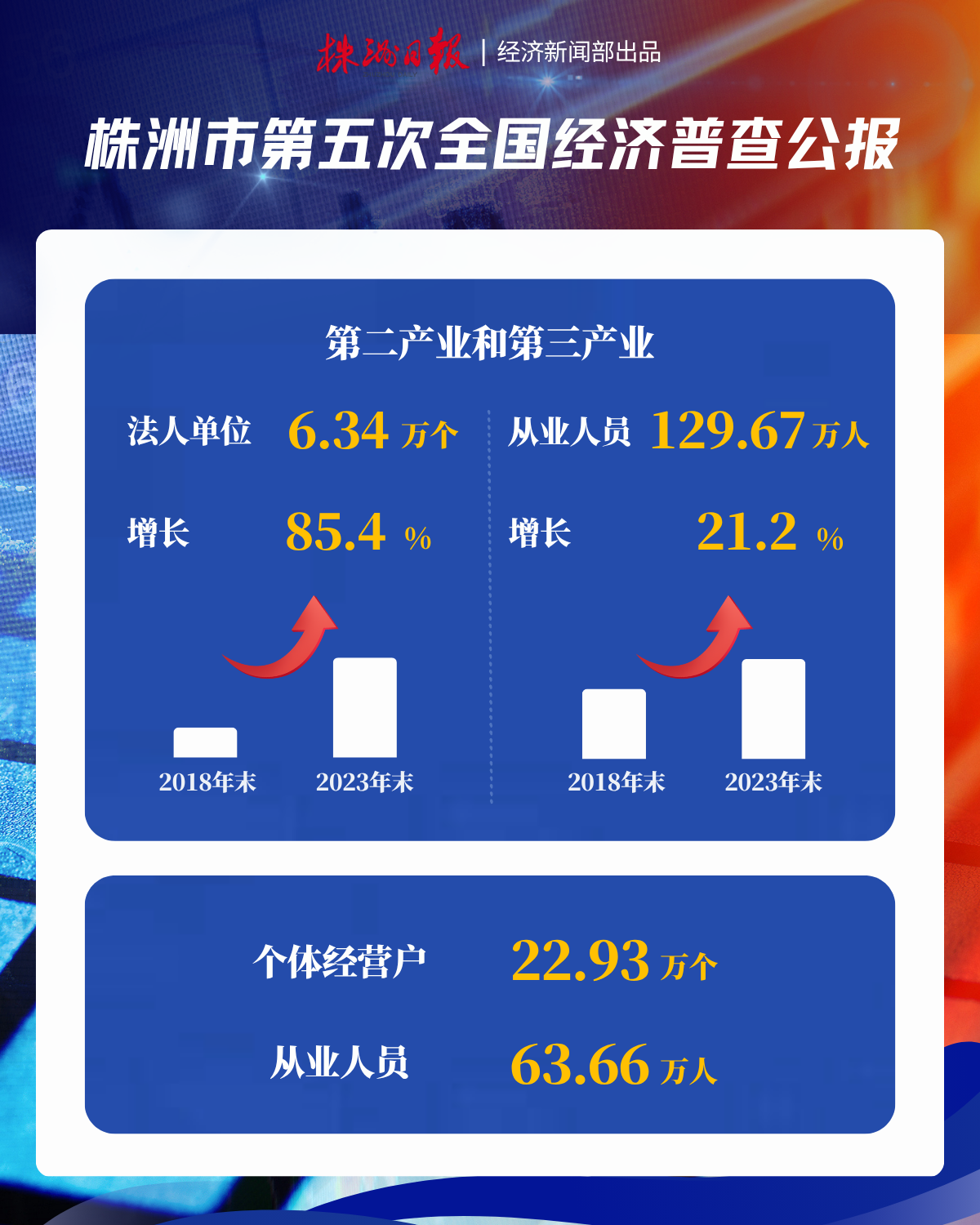 株洲日报讯(全媒体记者/刘芳 通讯员/罗康) 近日,市统计局发布《株洲市第五次全国经济普查公报》(以下简称《公报》)。《公报》显示,2023年末,全市共有从事第二产业和第三产业活动的法人单位6.34万个,比2018年末增长85.4%;个体经营户22.93万个,从业人员63.66万人。