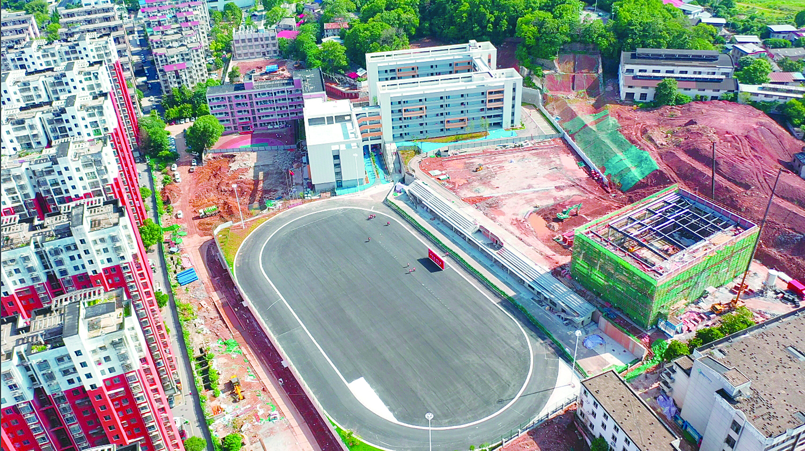 6月5日,田心中学新建300米标准操场提前交付使用,一旁新建的艺体馆正在进行钢屋架施工,新艺体馆将预计本月底完工。根据计划,田心中学改扩建项目将于今年8月底前全部完工,改造完成后将新增1000多个学位。