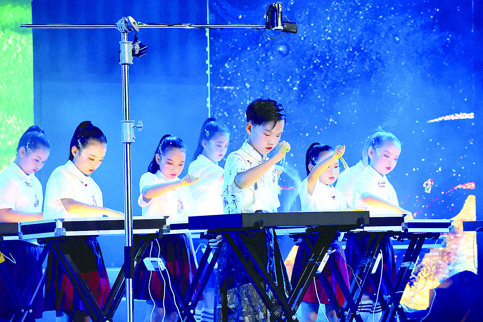 夜晚的舞台演出则以“立志·稚子初声”为序章,下设“启航·童心向阳”“绽放·多彩华章”“飞扬·逐梦未来”三个篇章。演出在铿锵有力的《少年有志》中开始,有动听的歌曲《成长在祖国的怀抱里》,有美妙的舞蹈《跳舞街》,也有妙趣横生的英语配音《哪吒之魔童降世》,最后在诗朗诵《梦,在外国语绽放》中结束了展演。