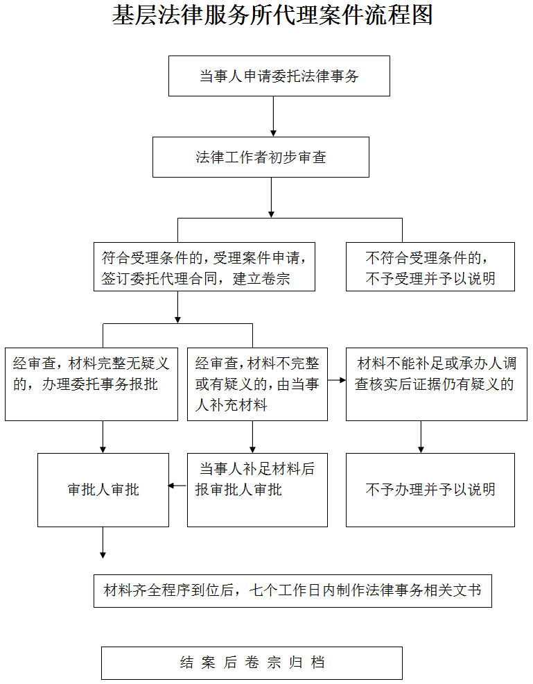 委托人向律师告知意向委托的事项并全面介绍有关情况→律所风险告知→委托人与律所签订《委托代理协议》,律所与委托人商定代理律师→委托人签订《授权委托书》→委托人按照《委托代理协议》的约定向律所支付法律服务费,律所开具合法票据→代理律师开展工作。
