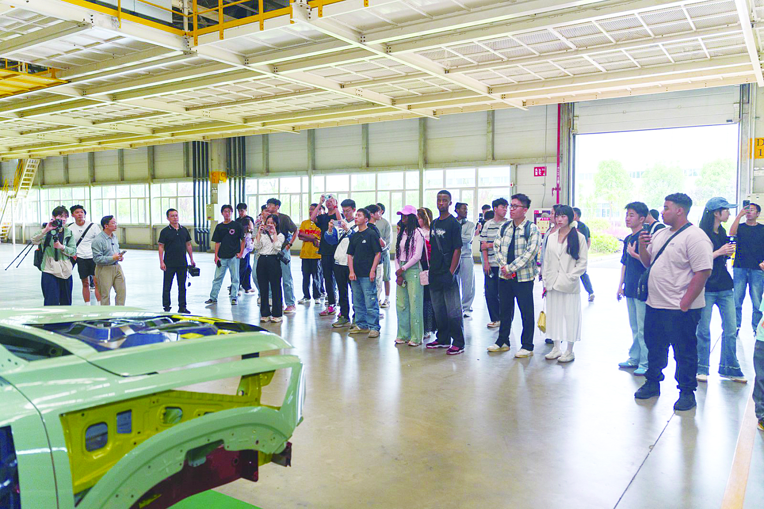 从冷硬钢板变身靓丽车身,在全自动化的冲压车间里,仅需5秒钟。作为整车制造四大工艺之首,超级工厂最大压力机吨位达5400吨,一次性制造出复杂的大型部件不在话下。学子们感叹“大开眼界!”