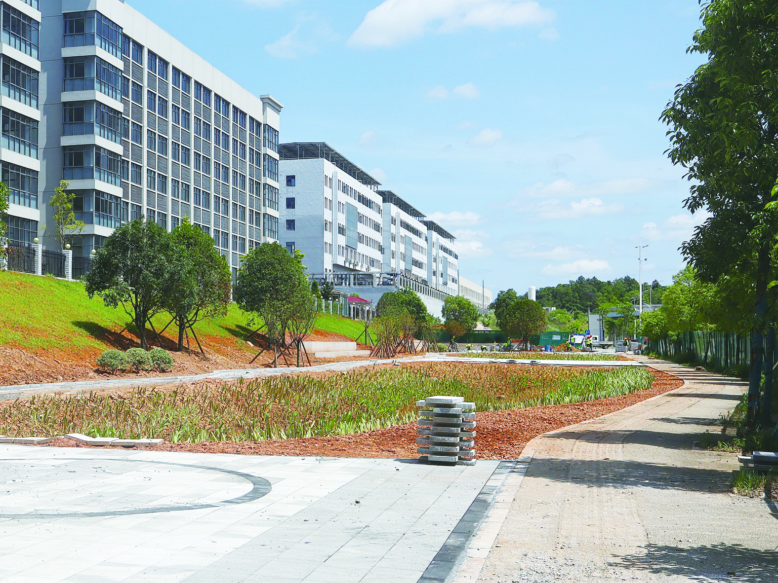 新建海绵公园占地面积6732平方米,由一处城市荒地建设而来。公园包含2处铺装广场和3处雨水花园,雨水花园内遍植鸢尾、美人蕉、矮芦苇等挺水植物(即植物的根、根茎生长在水的底泥之中,茎、叶挺出水面)。目前,新建海绵公园正在进行广场透水砖铺设、游步道透水混凝土摊铺、景观石安装等作业,很快就能对外开放。