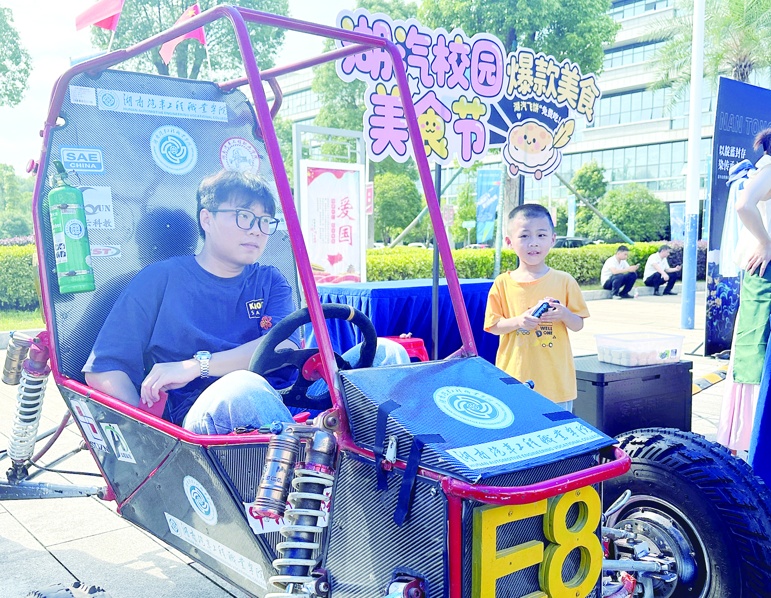 该校学生自制的越野小车,吸引小朋友的关注。 记者/戴凛 摄