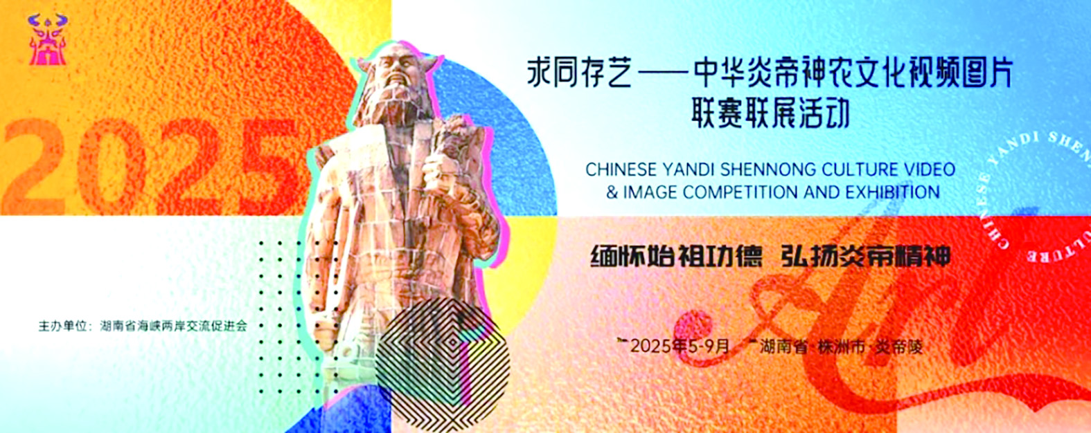 活动由湖南省海峡两岸交流促进会主办,围绕炎帝八大功德、炎帝精神主题,深入挖掘其在农业、医药、文化等方面的贡献,通过作品展现炎帝为中华民族发展、繁荣做出的开创性、历史性贡献。