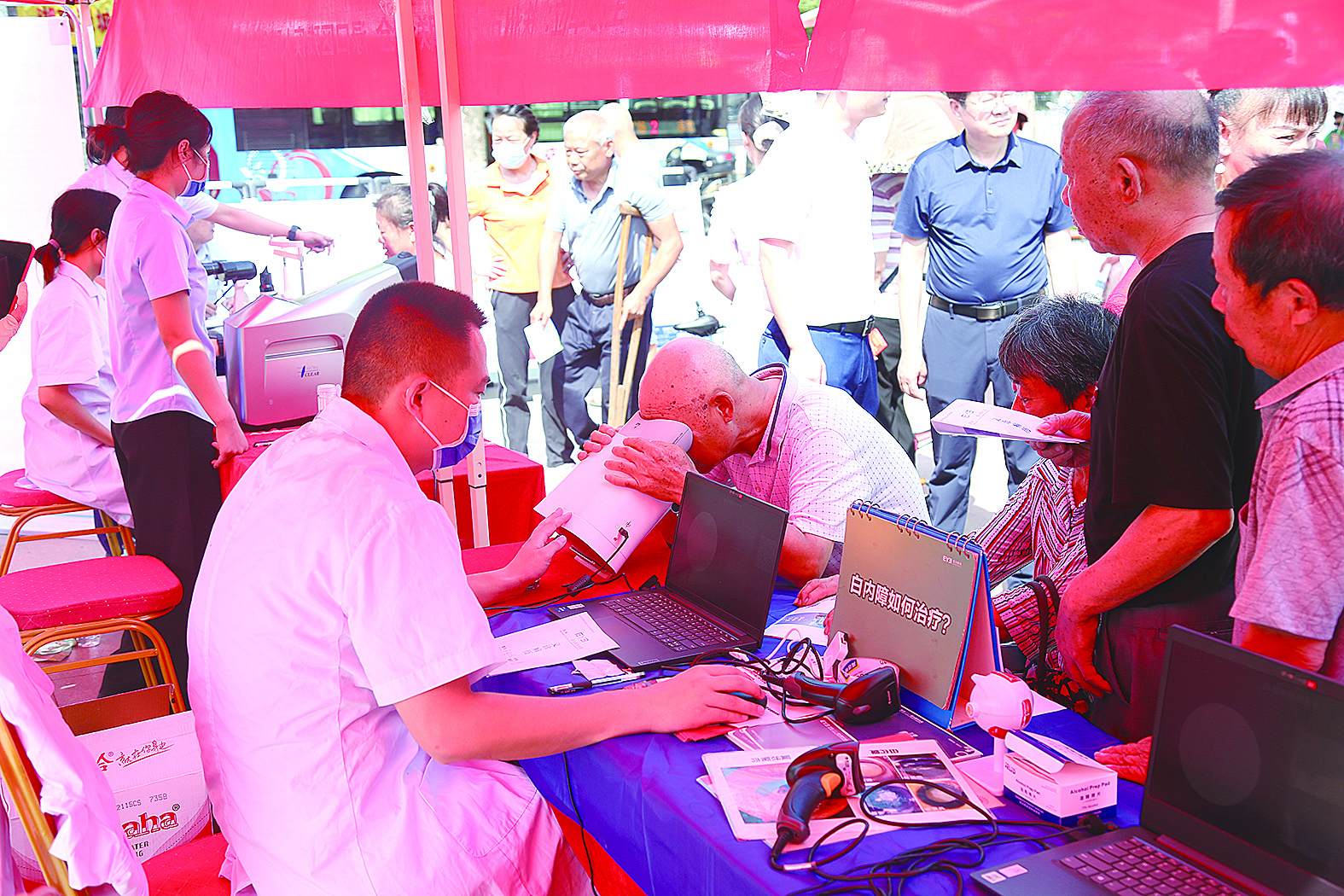 爱尔眼科的专业医疗团队通过视力检测、裂隙灯检查、电脑验光等方式,为群众提供免费眼科检查,重点筛查白内障、青光眼等致盲性眼病,同步开展糖尿病视网膜病变眼底检查、干眼症诊疗及螨虫检测,并提供雾化熏蒸现场体验、青少年近视防控与成人激光手术屈光咨询,工作人员向市民发放爱眼护眼宣传资料,传播科学用眼知识。