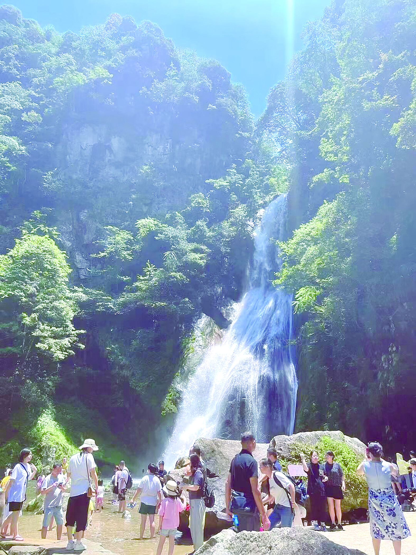 游客们在珠帘瀑布前享受夏日清凉 。 炎陵县委宣传部供图