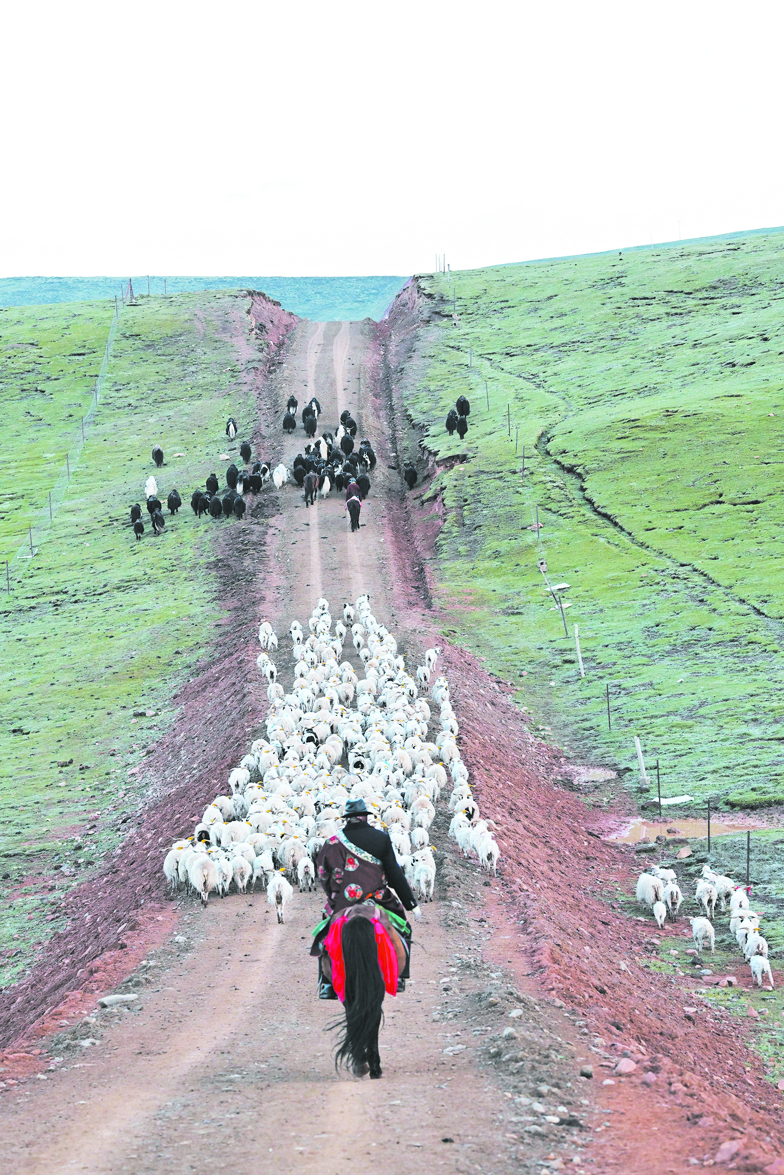 6月25日清晨,万卓赶着羊群转场。 盛夏时节,祁连草原绿茵如毯。在青海省海北藏族自治州祁连县,牧民们正赶着牛羊,陆续从冬牧场出发,踏上数百里的迁徙之路。跋山涉水,几经休整,他们最终抵达海拔3700多米的夏季牧场“安营扎寨”,开启为期40余天的夏牧场生活。 祁连县默勒镇才什土村的61岁牧民万卓,便是这转场队伍中的一员。今年夏天,他与外甥先巴尖措历时两天完成了转场。第一天清晨五点,两人便骑马赶着60多头牛和300多只羊启程,翻山越岭行进40多公里后短暂歇息;次日清晨再次出发,走完剩余路途,抵达目的地,开始夏牧场生活。 新华社记者 张龙 摄