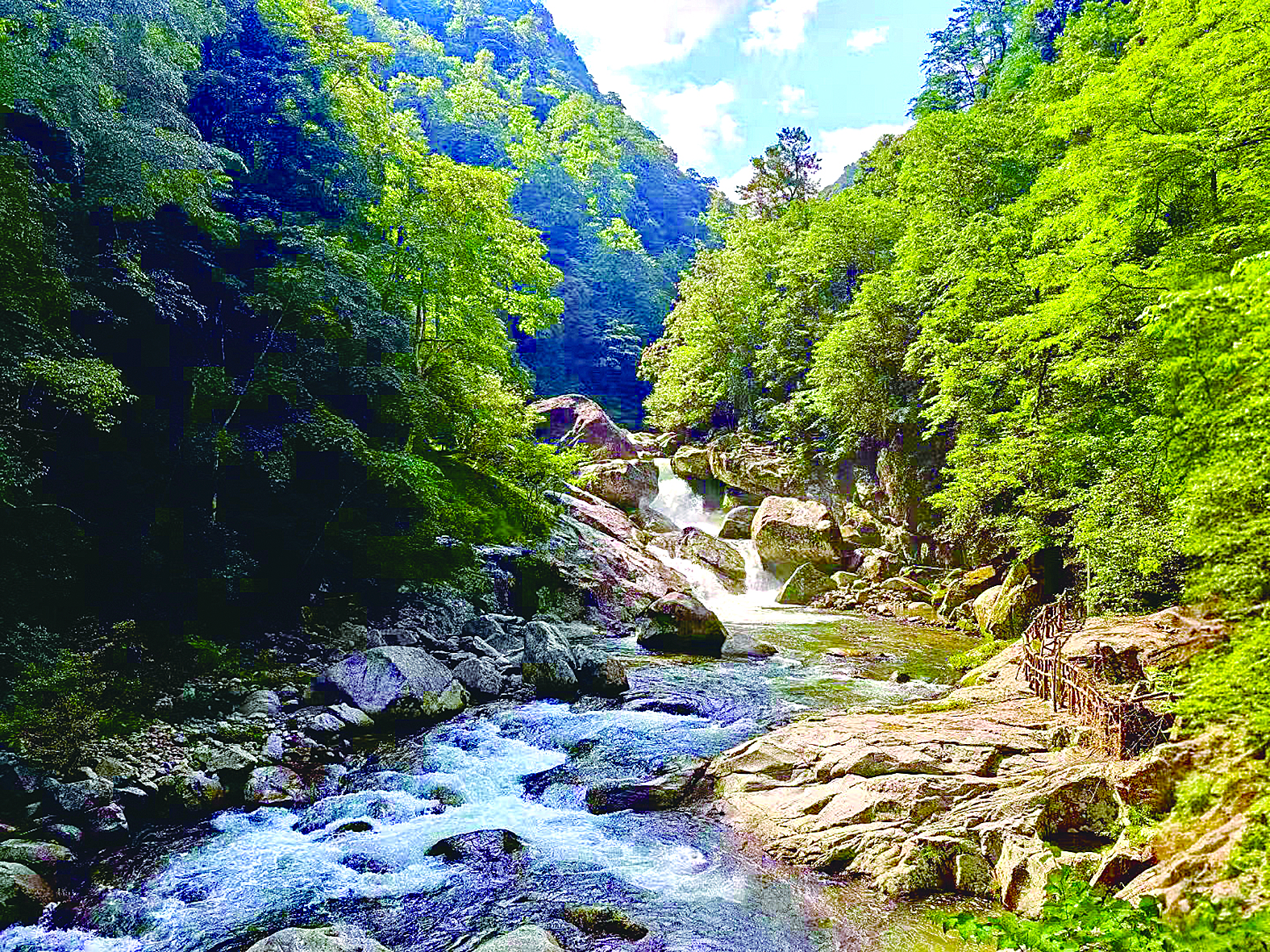 进入谷内,但见连绵起伏的群山中,参天的树木泛起苍翠欲滴的绿意,像进入了一个丰茂干净的绿色仙境。欢快的溪水在石隙间跳跃,或跌落在石臼里旋出小小漩涡,或撞碎在巨石上散作银珠。车行几分钟,到达徒步起点落水源,下车整理好行装,我们即向着落水源瀑布出发。沿着蜿蜒溪沟的步道进入峡谷,初夏的阳光透过茂密的树叶,点点金辉洒在我们身上,几只黄蝴蝶在林间翩翩起舞,整个人被清新的空气包围着,这可是大自然最直接的馈赠。