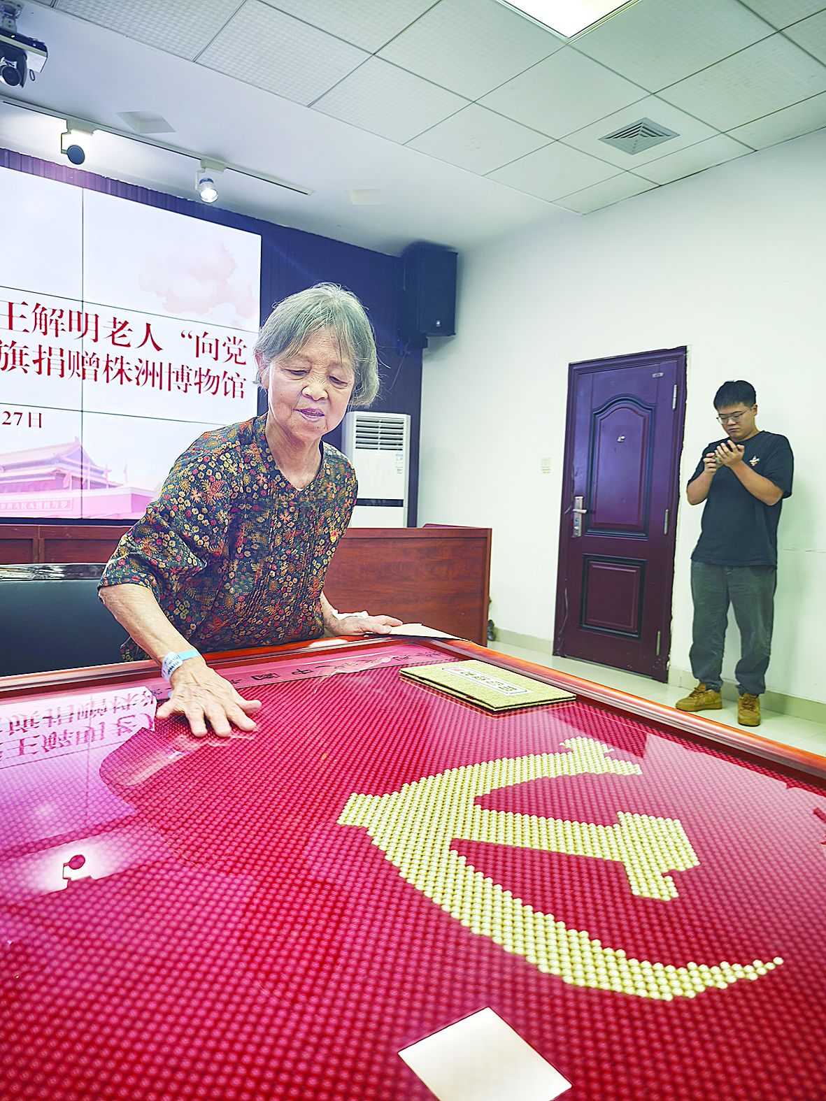 株洲日报讯(全媒体记者/杨凌凌) 6月27日,株洲博物馆收到一份特殊的捐赠。芦淞区建宁街道75岁的党员王解明,用1万多颗串珠制成一面党旗,在“七一”来临之际,她将手工制作的党旗捐赠给株洲博物馆。