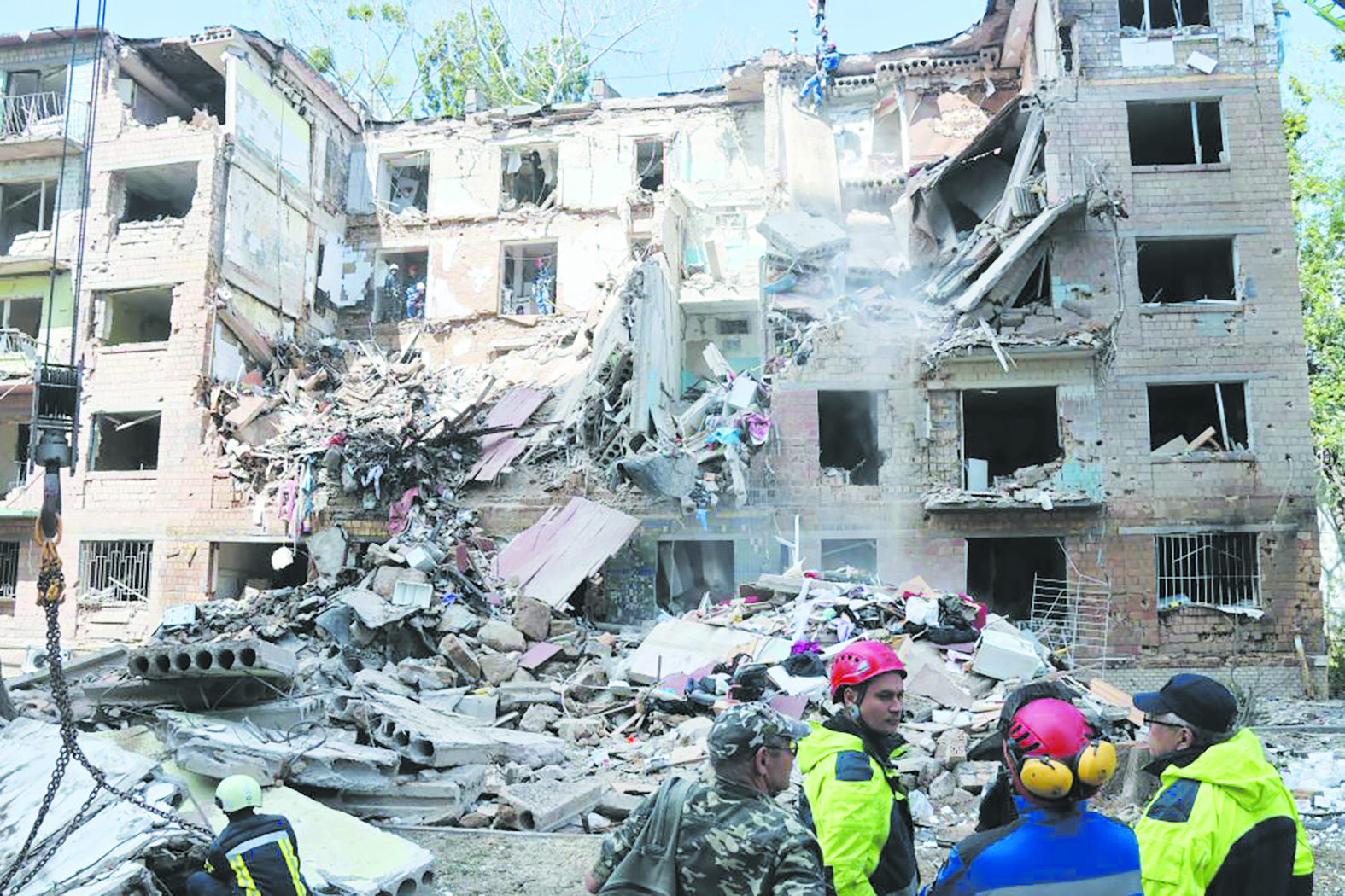 6月23日,乌克兰国家紧急情况局说,当天凌晨俄军对乌首都基辅发动空袭。图为该局工作人员当天在基辅市舍甫琴科夫斯基区遭空袭现场进行搜寻和清理工作。新华社发(彼得·德鲁克摄)