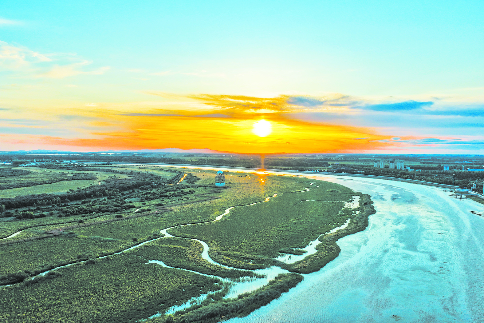 7月4日在黑龙江省佳木斯市同江市三江口国家湿地公园拍摄的年度“最小太阳”(无人机照片)。 当日,年度“最小太阳”登场。4时,地球过远日点,这是一年中地球距离太阳最远的时刻,此时,太阳视直径为全年最小。 新华社发