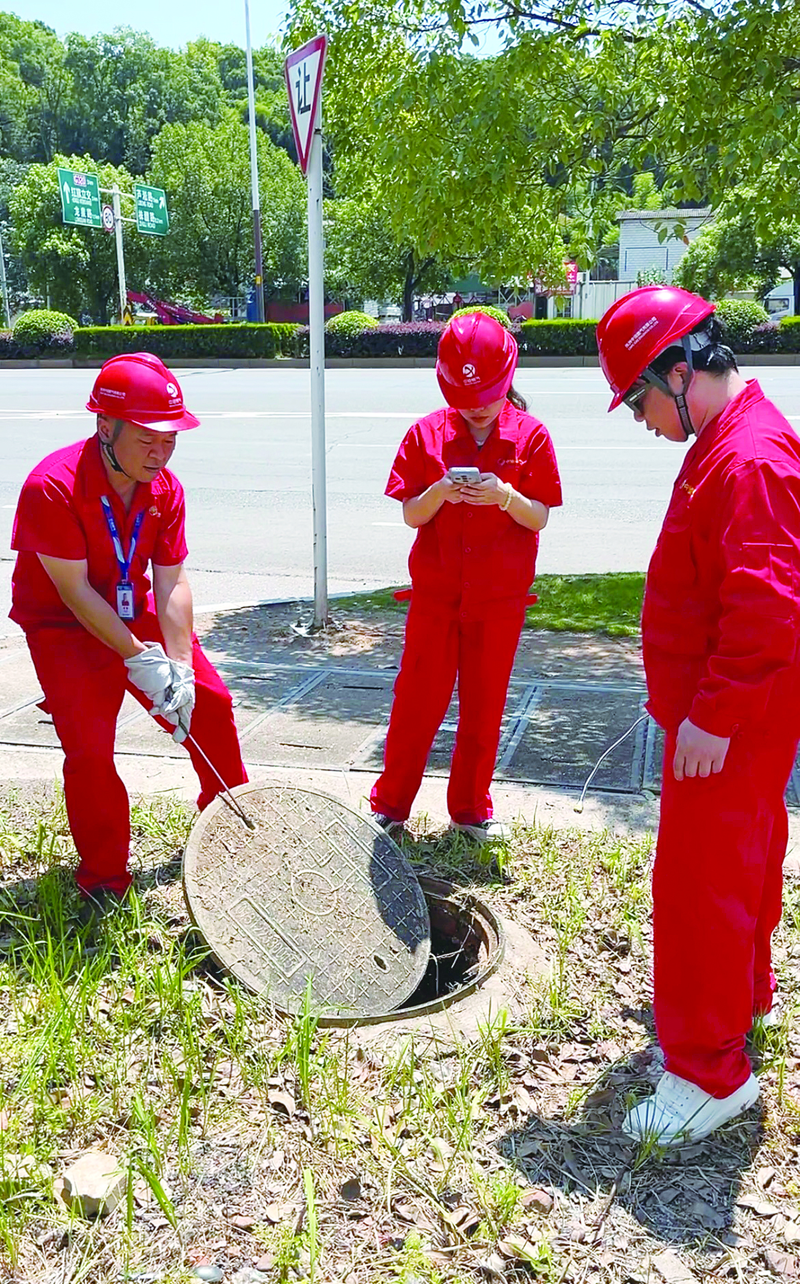 工作人员冒着酷暑查找安全隐患。记者/刘平 摄