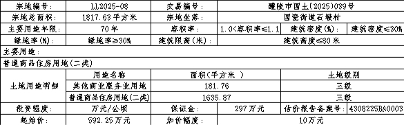 LL2025-08:(一)竞得者应在成交确认书签订之日起10个工作日内签订出让合同。(二)土地成交价款由竞得者在出让合同签订之日起半年内全额缴清,逾期未缴部分,根据相关规定,征收违约金。(三)由醴陵市土地储备中心按现状条件交地,并承担因交地产生的相关法律责任。(四)须按醴陵市自然资源局出具的《醴陵市储备B04-03地块用地性质认定蓝线图及规划条件》实施。