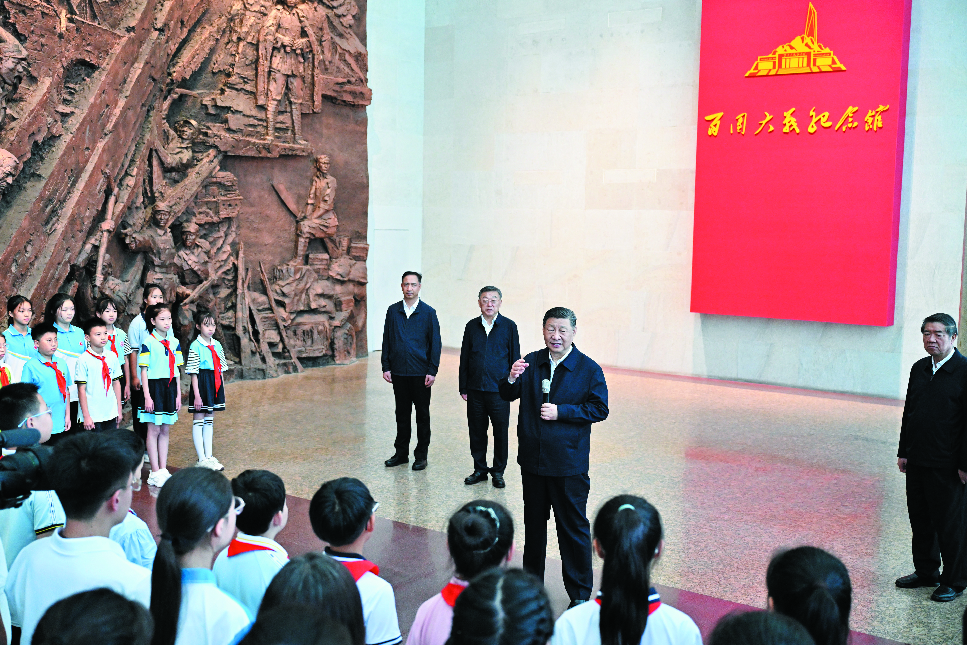 7月7日至8日,中共中央总书记、国家主席、中央军委主席习近平在山西考察。这是7日下午,习近平在位于阳泉市狮脑山的百团大战纪念馆考察时,同前来参观的青少年学生和纪念馆工作人员亲切交流。 新华社记者/殷博古 摄