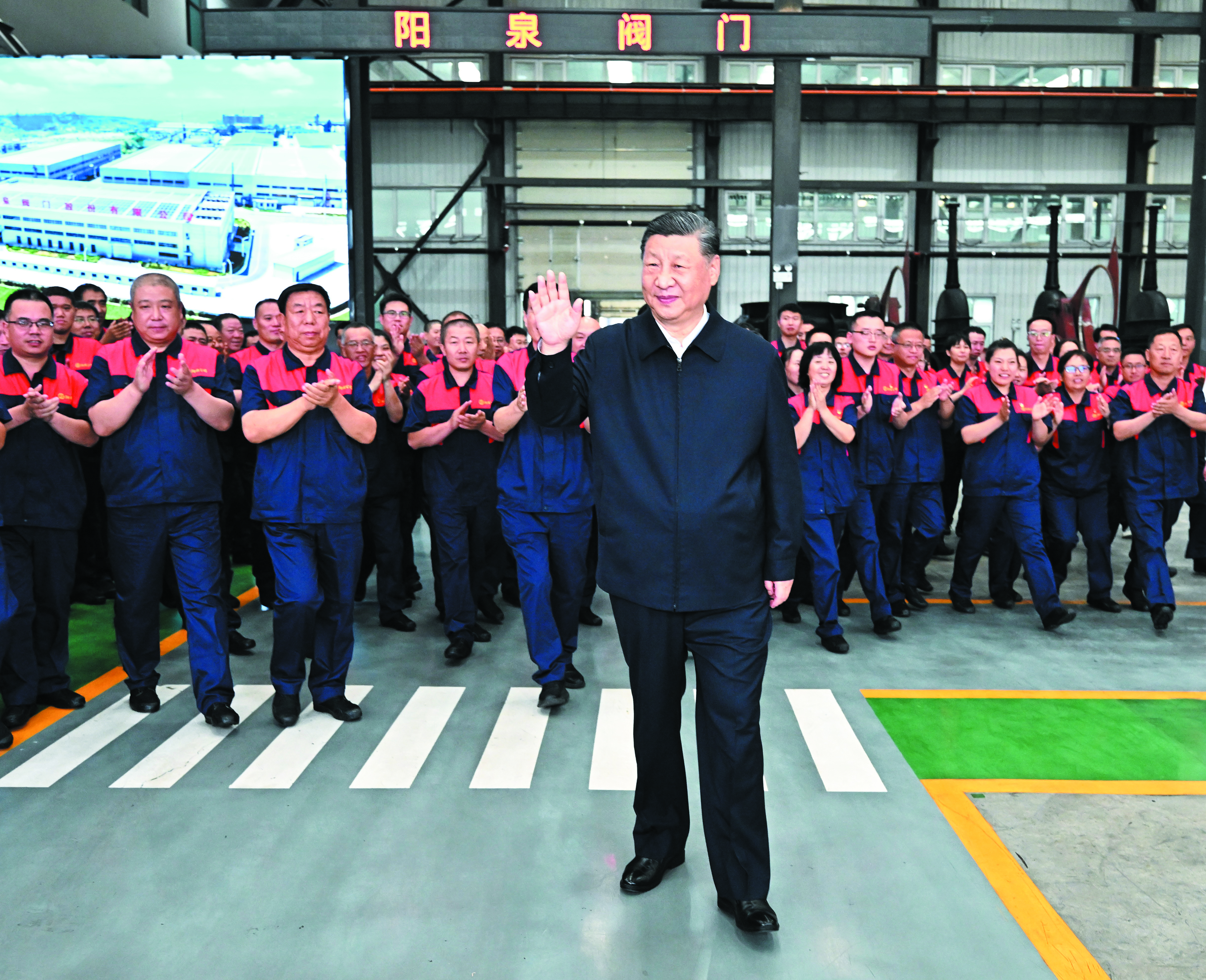 7月7日至8日,中共中央总书记、国家主席、中央军委主席习近平在山西考察。这是7日下午,习近平在阳泉阀门股份有限公司考察时,同企业员工在一起。 新华社记者/燕雁 摄