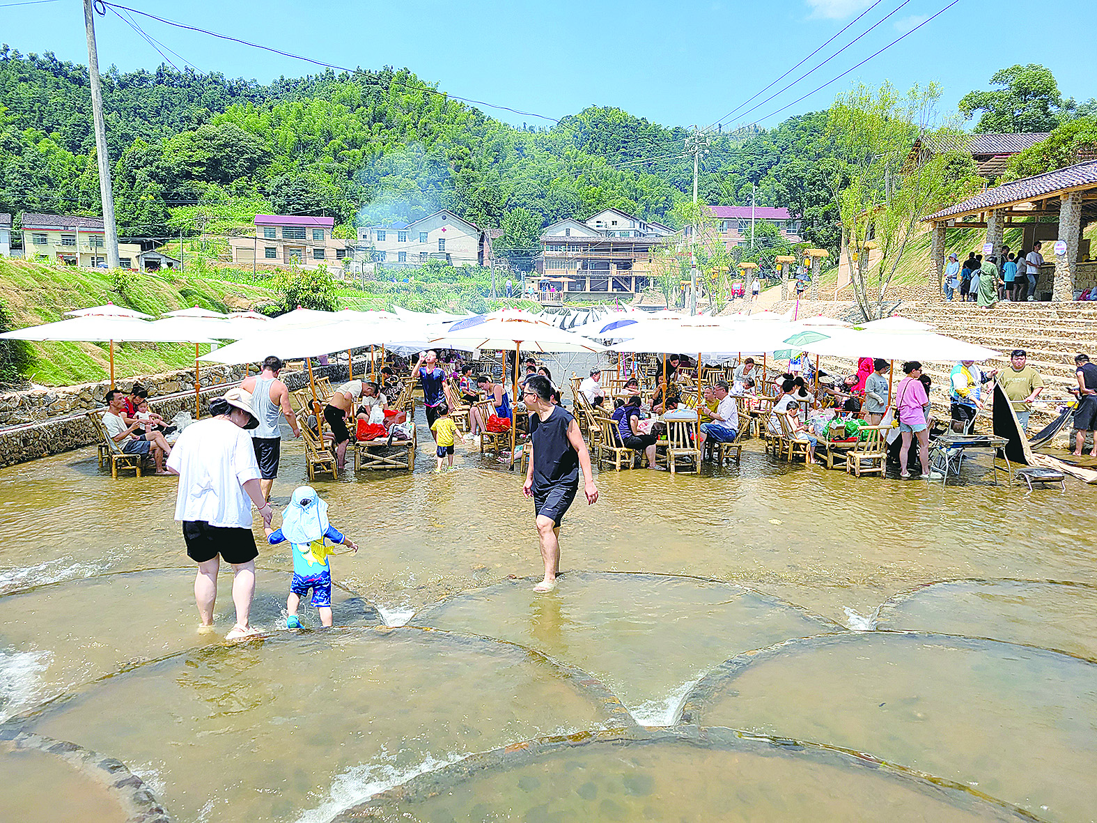 上午10时,太阳高照,远远看去,溪水里、石滩上已搭起不少天幕,大人们悠闲地聊天、准备烧烤美食,小孩成群结队在水中嬉戏,或展开水枪大战,或驾着小竹筏漂流。往上行走,今年5月修建好的“鱼鳞坝”,因其独特的造型,成了游客最喜爱的拍照打卡地。“溪水清澈,周末和家人朋友一起来这里避暑,是个不错的选择。”游客邓女士说。