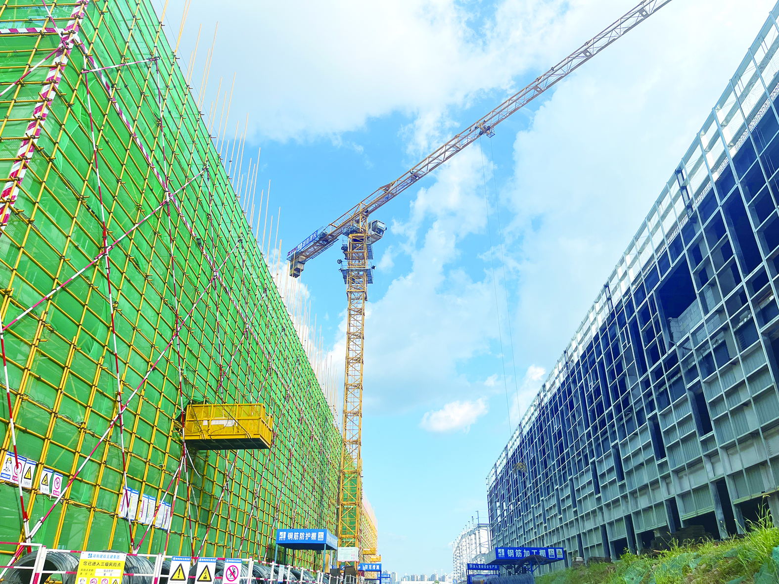 株洲905基地项目现场,10栋建筑正拔地而起。其中,5栋钢结构厂房已全部封顶。迎着明晃晃的阳光抬眼望去,蓝天白云间,塔吊旋转,7号研发厂房、8号倒班楼在建设者的努力下,正在加快“生长”,已经完成5层楼板浇筑。