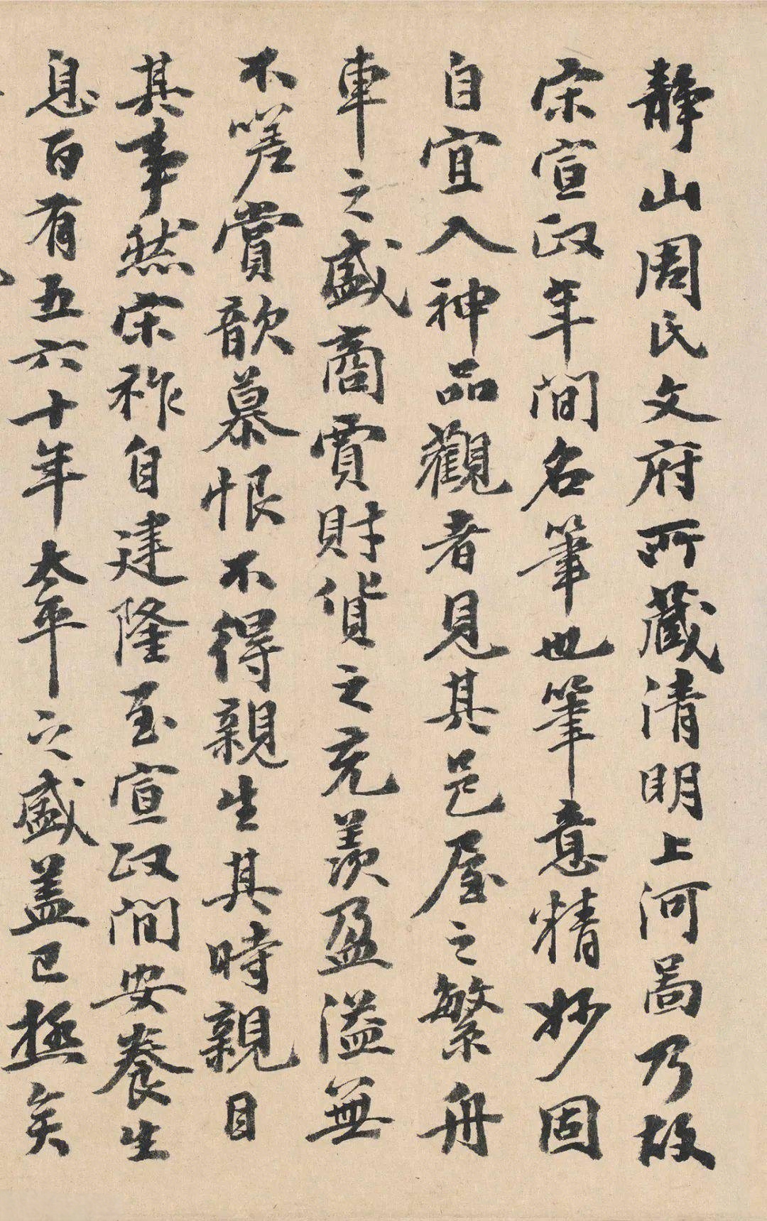 1365年,静山周文府携画前来江西永新上麓书院请其鉴定。确认真迹之后,李祁慨然题跋:“静山周氏文府所藏清明上河图,乃故宋宣政年间名笔也,笔意精妙,固自宜入神品。观者见其邑屋之繁,舟车之盛,商贾财货之充羡盈溢,无不嗟赏歆慕,恨不得亲生其时,亲目其事……”他先赞画艺神妙,描绘汴梁繁华,令人神往;随即话锋陡转,由宋之极盛联想到“天下之势,未有极而不变者”,发出盛世危言,痛切告诫后世君臣“宜以此图与无逸图并观之”,以“忧勤惕厉”之心“长守富贵”。