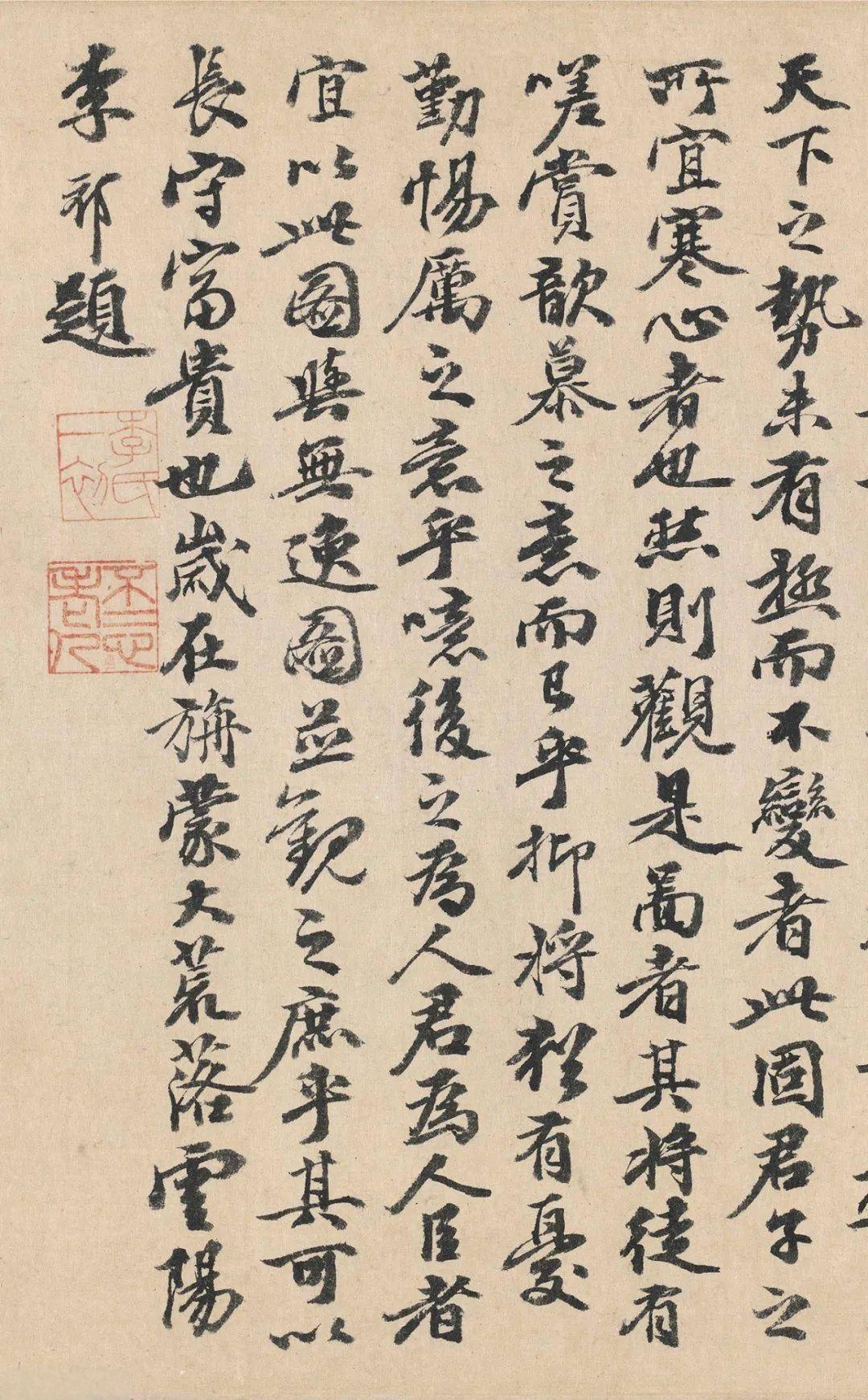中国书法推崇“书以载道”,王羲之《兰亭序》、颜真卿《祭侄文稿》、苏轼《寒食帖》无不是将人文情怀、生命感悟倾注笔端的千古绝唱。李祁的《题跋<清明上河图>》,也正是这样一件“书文并茂”、直抵“载道”境界的难得佳作。
